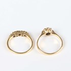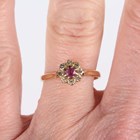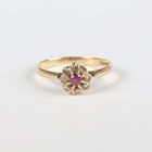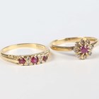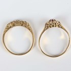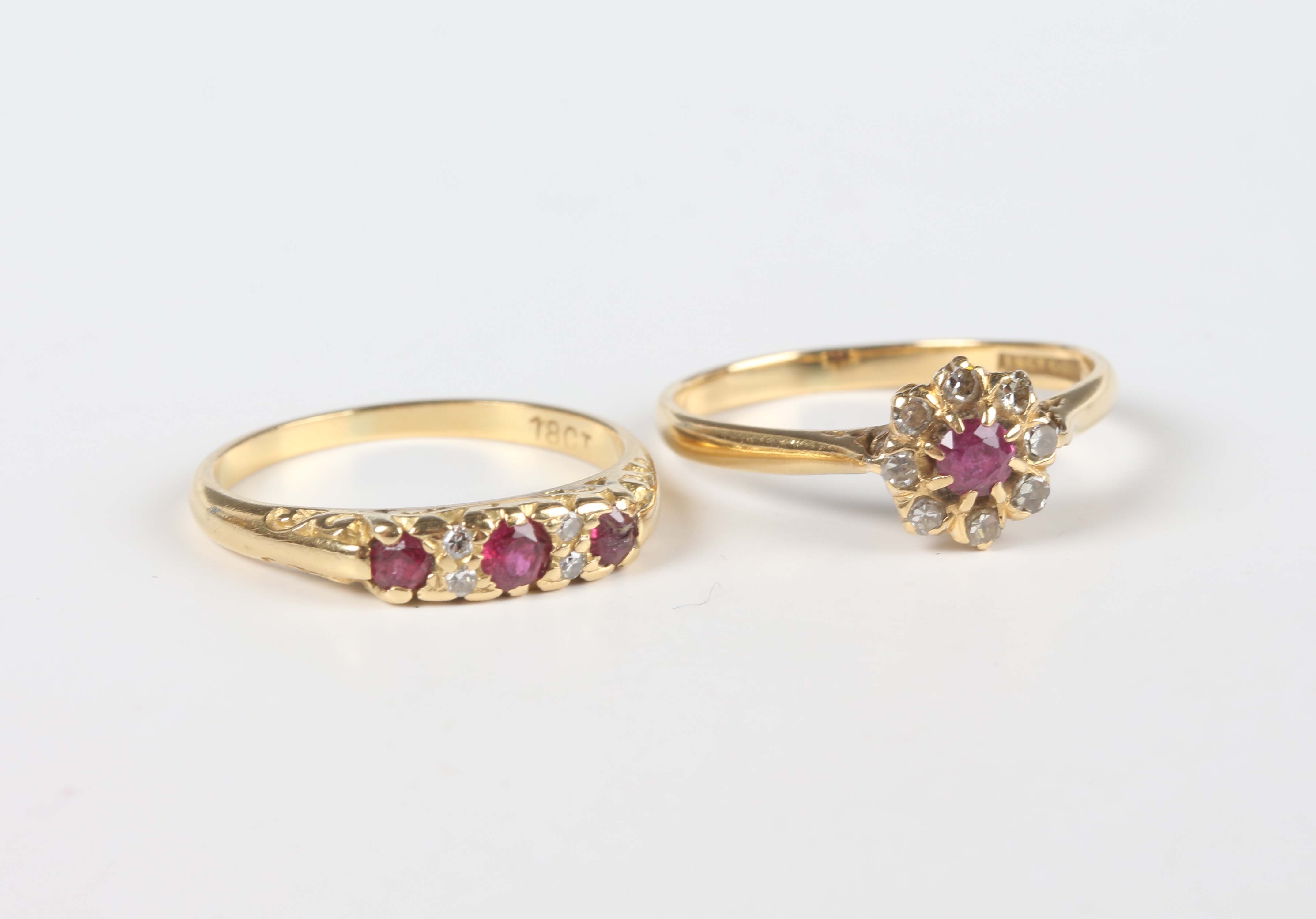 A gold, ruby and diamond nine stone cluster ring, claw set with the circular cut ruby within a surround of eight circular cut diamonds, detailed ‘18ct Gold’, ring size approx L1/2, and a gold, ruby and diamond ring, mounted with three rubies alternating with two pairs of diamonds, detailed ‘18ct’, ring size approx L1/2, total weight 5.1g.