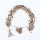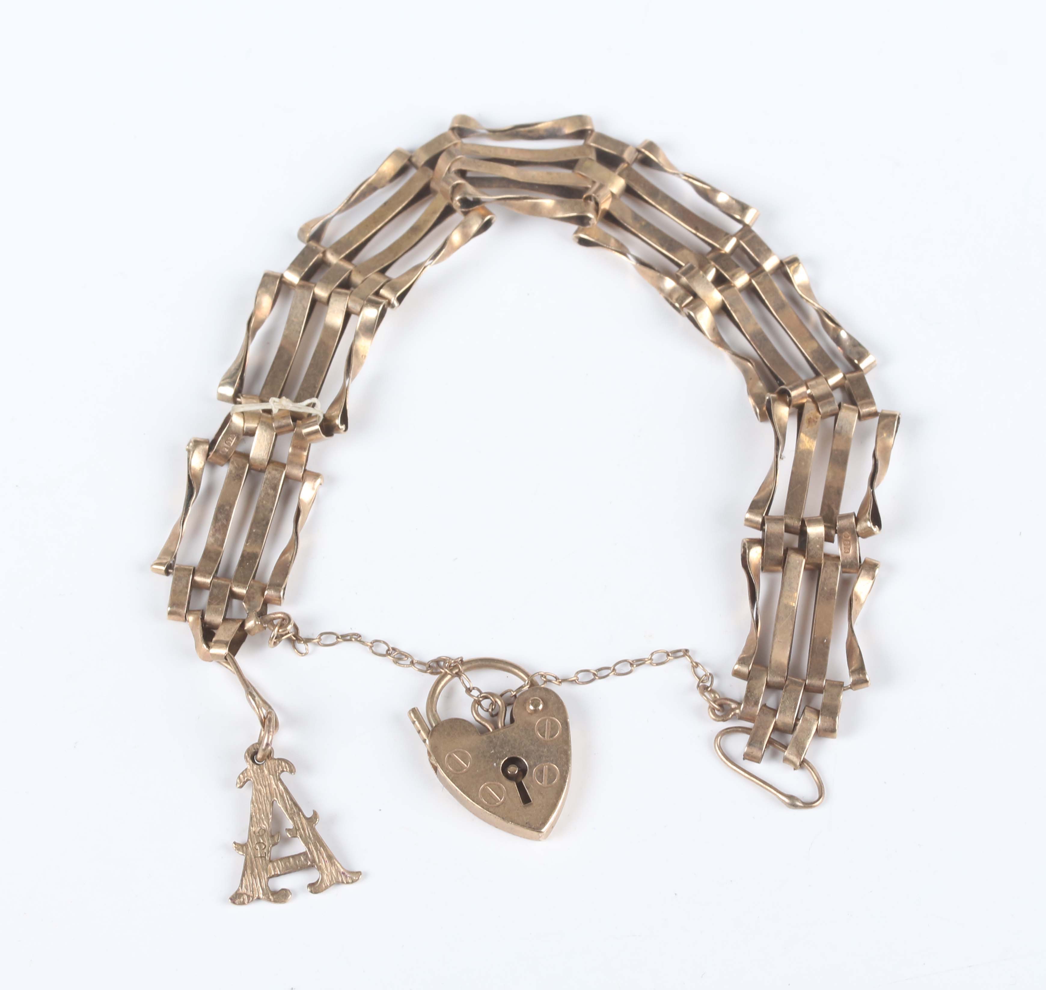 A gold gatelink bracelet on a 9ct gold heart shaped padlock clasp, fitted with a 9ct gold initial 'A' charm, total weight 8.7g, length of bracelet 15cm.