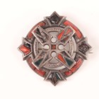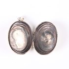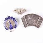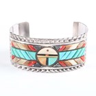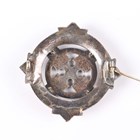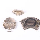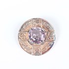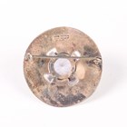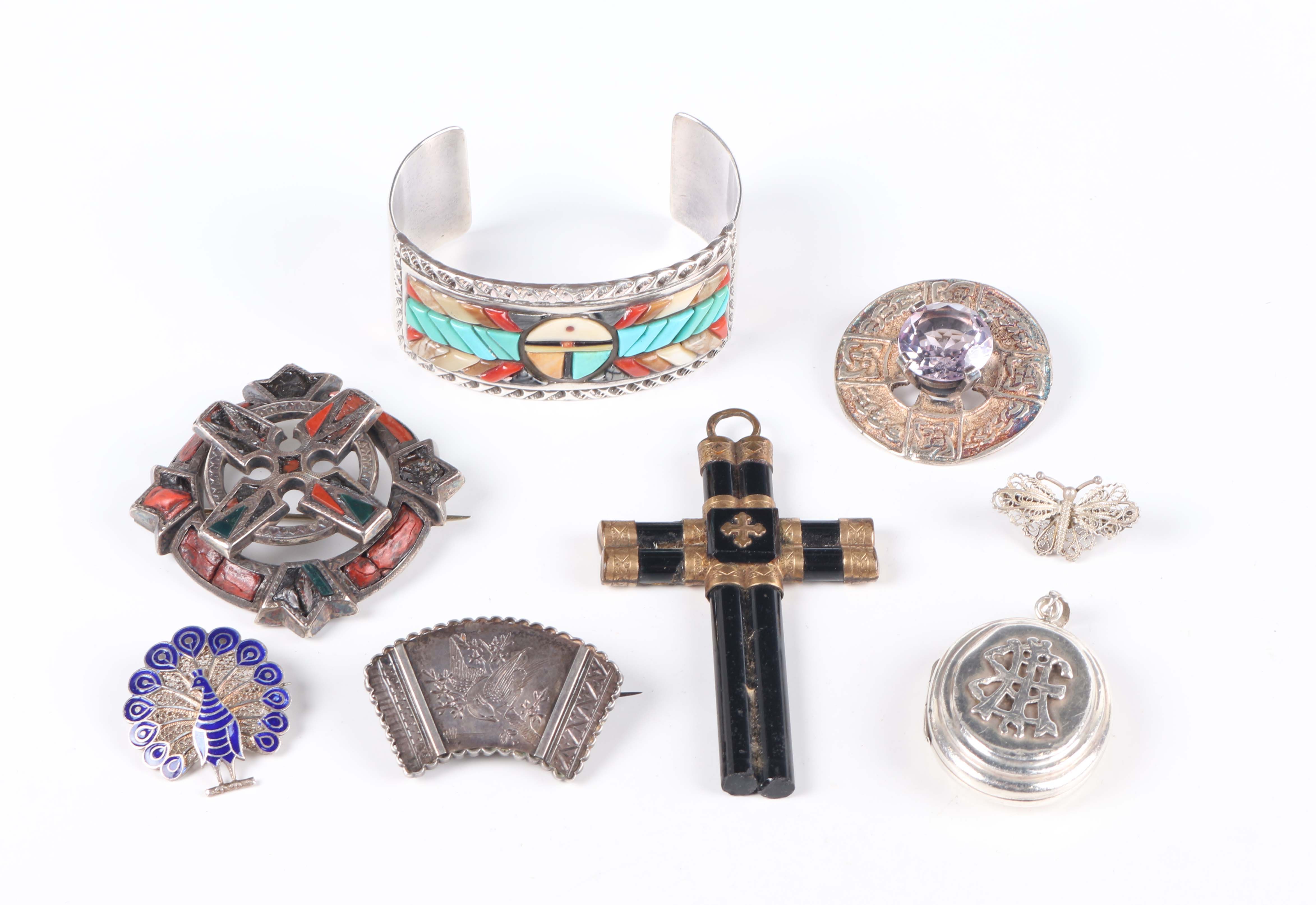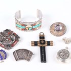 A Victor Moses Begay turquoise and coral inlaid bangle, detailed ‘VMB’, width 6cm, a Scottish silver and amethyst single stone brooch in a circular Celtic design, Edinburgh 1958, four further brooches, an oval pendant locket and a pendant cross.