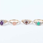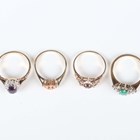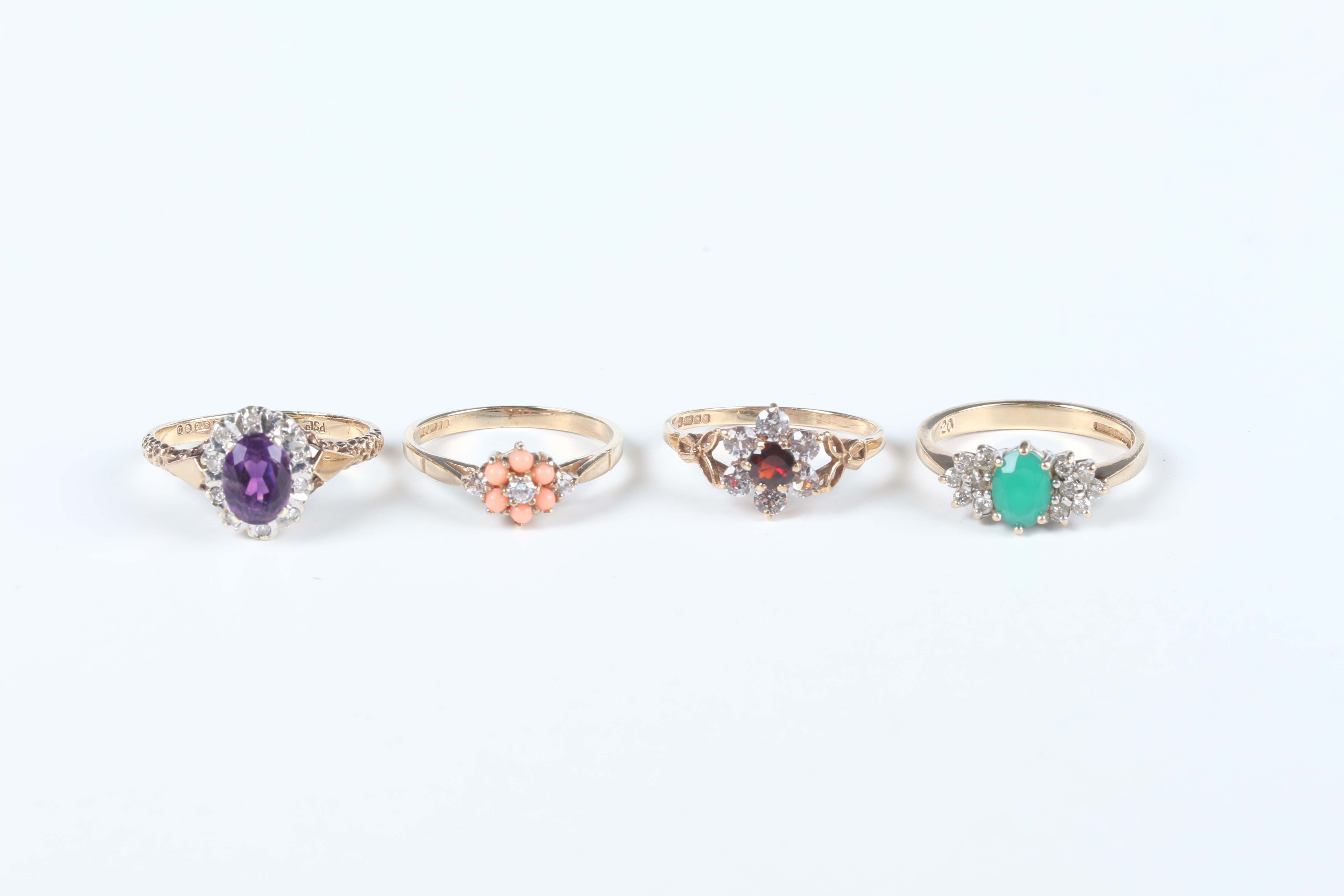 A 9ct gold, amethyst and diamond oval cluster ring, ring size approx P, a 9ct gold, diamond and green gem set ring, ring size approx O, a 9ct gold, coral and colourless gem set ring, ring size approx O, and a 9ct gold, garnet and colourless gem set seven stone cluster ring, ring size approx O, total weight 9.7g.