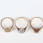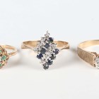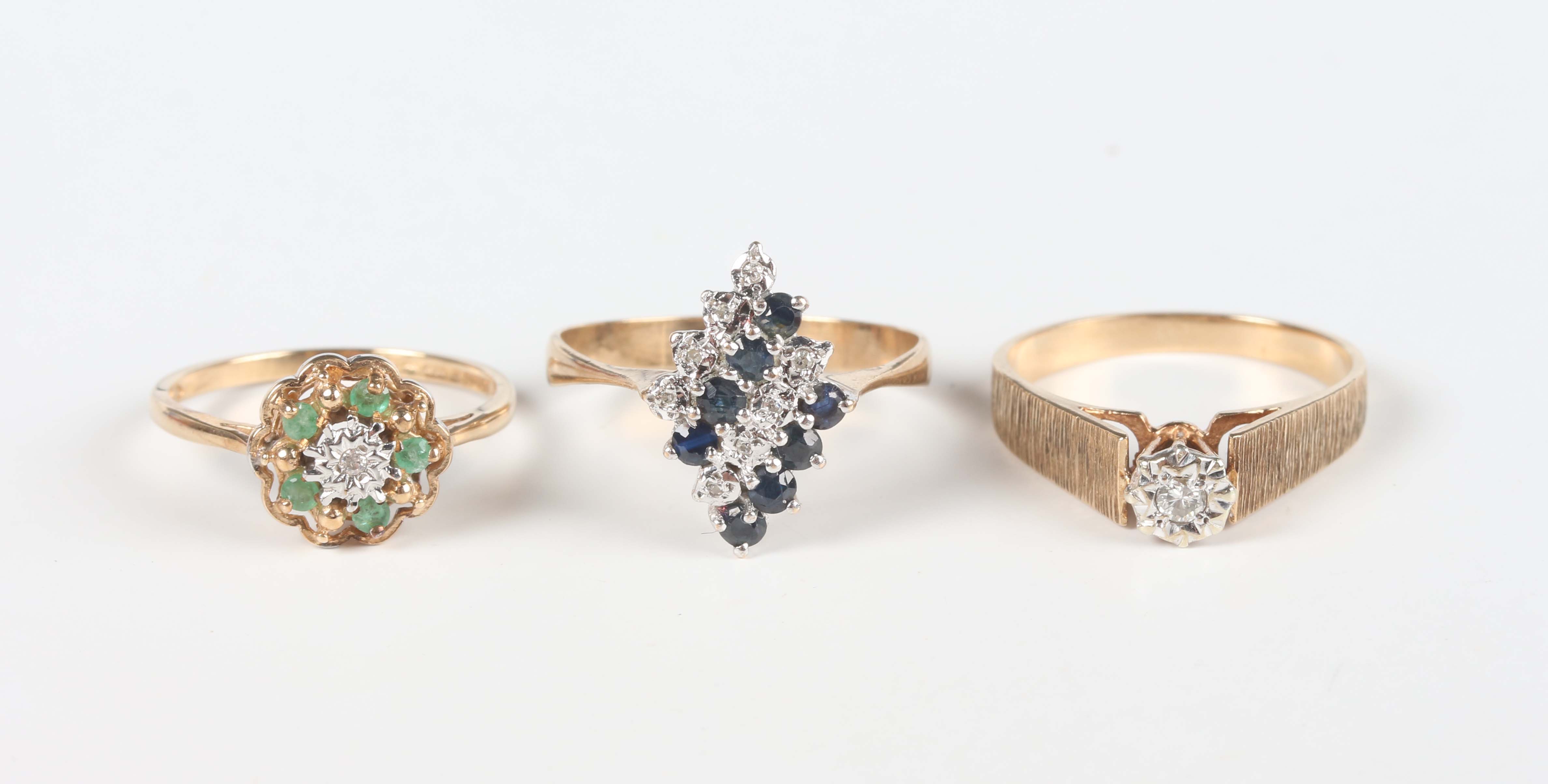 A 9ct gold, sapphire and diamond ring, mounted with two rows of four sapphires and two rows of four diamonds, ring size approx Q, a 9ct gold, emerald and diamond six stone cluster ring, ring size approx N1/2, and a 9ct gold and diamond single stone ring with bark textured decoration to the shoulders, ring size approx O, total weight 6.7g.