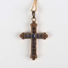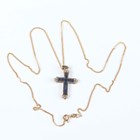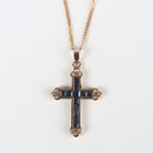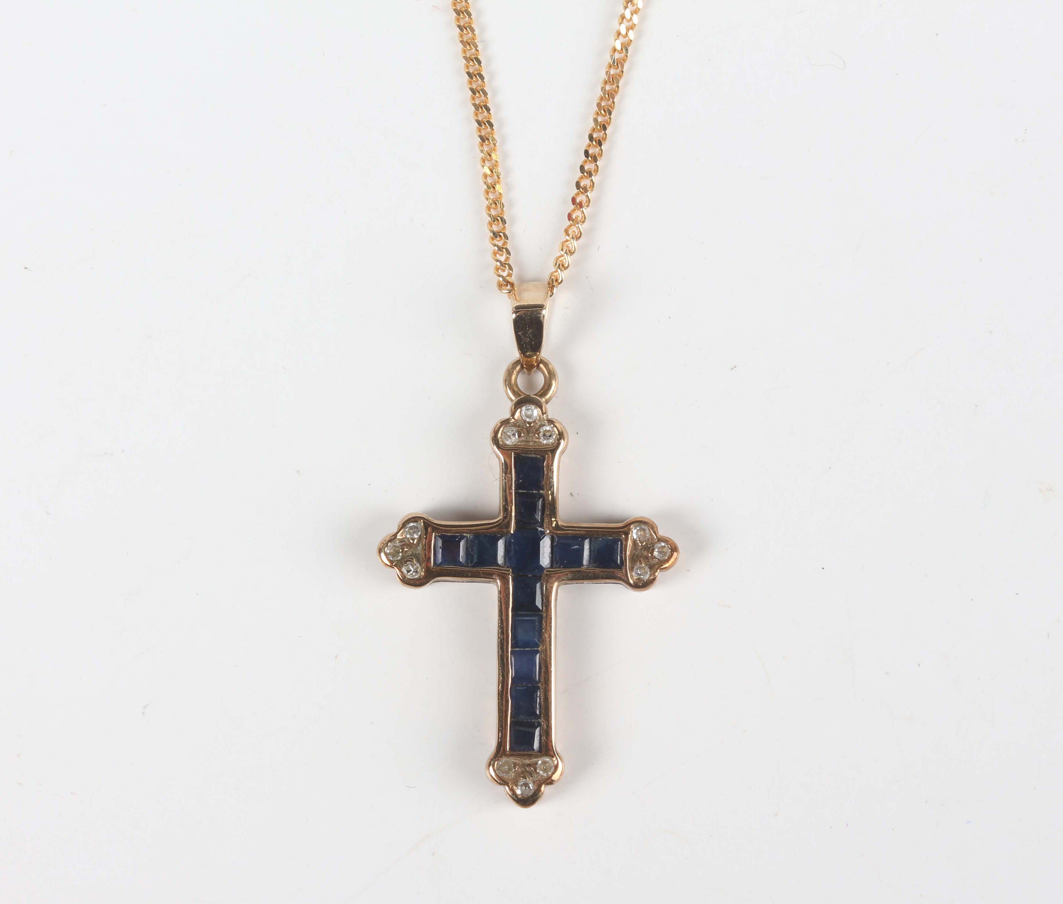 A 9ct gold, sapphire and diamond pendant cross, mounted with rows of square cut sapphires with diamond set three stone terminals, length 3cm, with a 9ct gold neckchain on a boltring clasp, length 45.5cm, total weight 3.5g, cased.