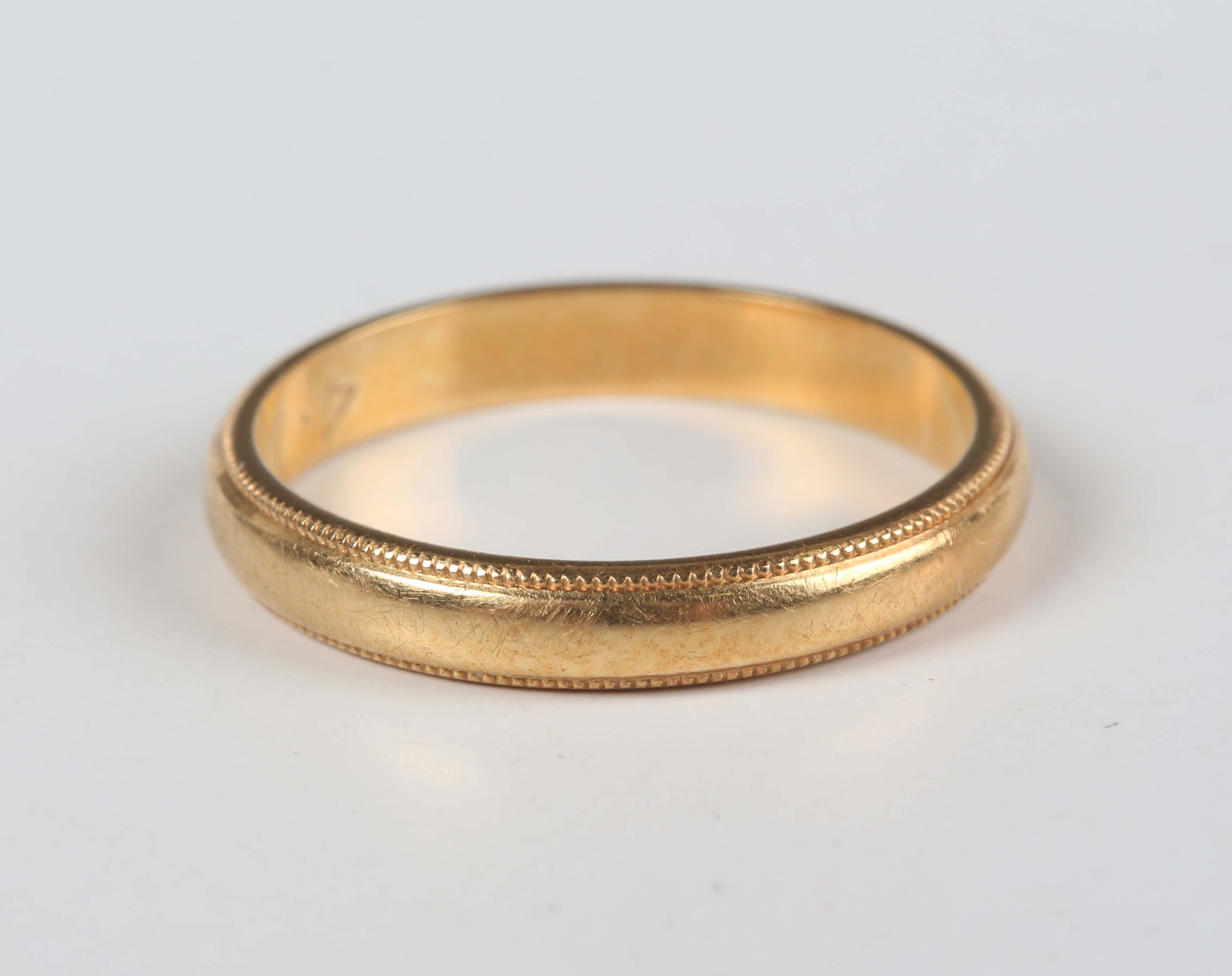 An 18ct gold wedding ring with beaded sides, Birmingham 1984, weight 2.8g, ring size approx L, cased.
