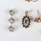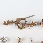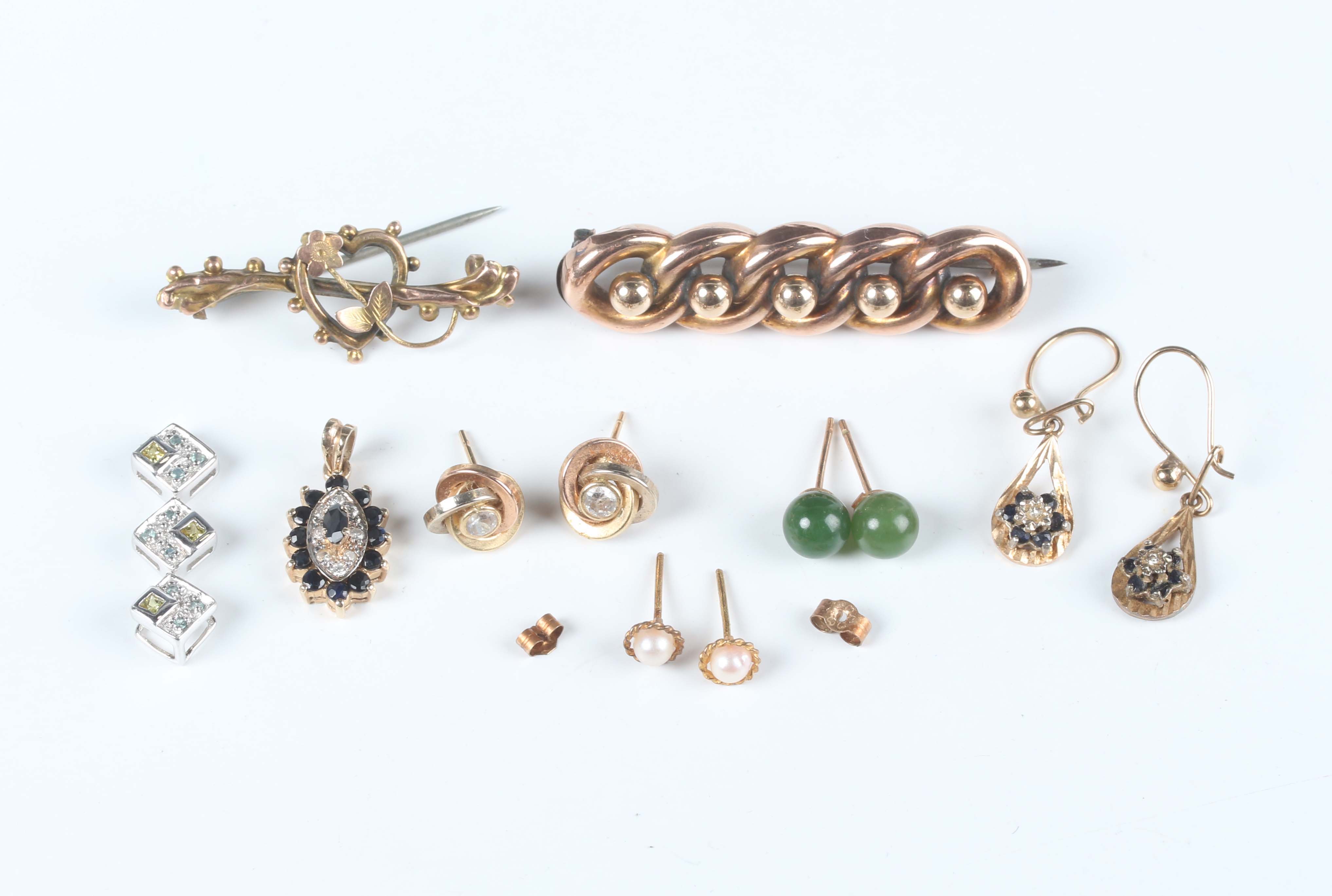 A Victorian 9ct gold brooch in a curb chain and bead design, Chester 1893, width 4.2cm, another gold brooch, a pair of 9ct gold, sapphire and diamond seven stone pendant earrings, a 9ct white gold and gem set pendant, total weight 8.4g, a sapphire and diamond oval pendant, unmarked, and three pairs of earstuds.