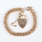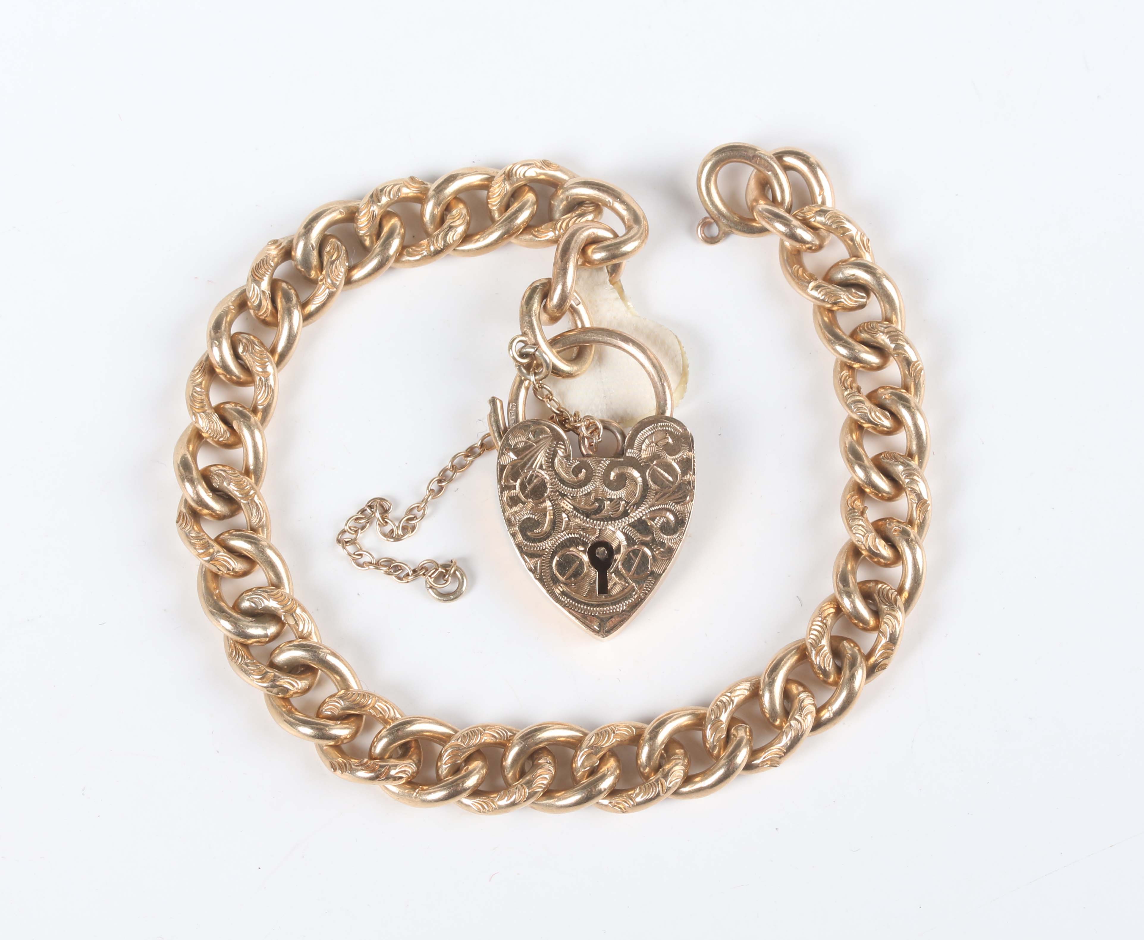 A 9ct gold decorated and plain curblink bracelet on a 9ct gold heart shaped padlock clasp with engraved decoration, total weight 30g, length 18cm.