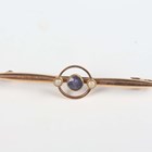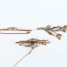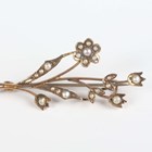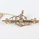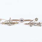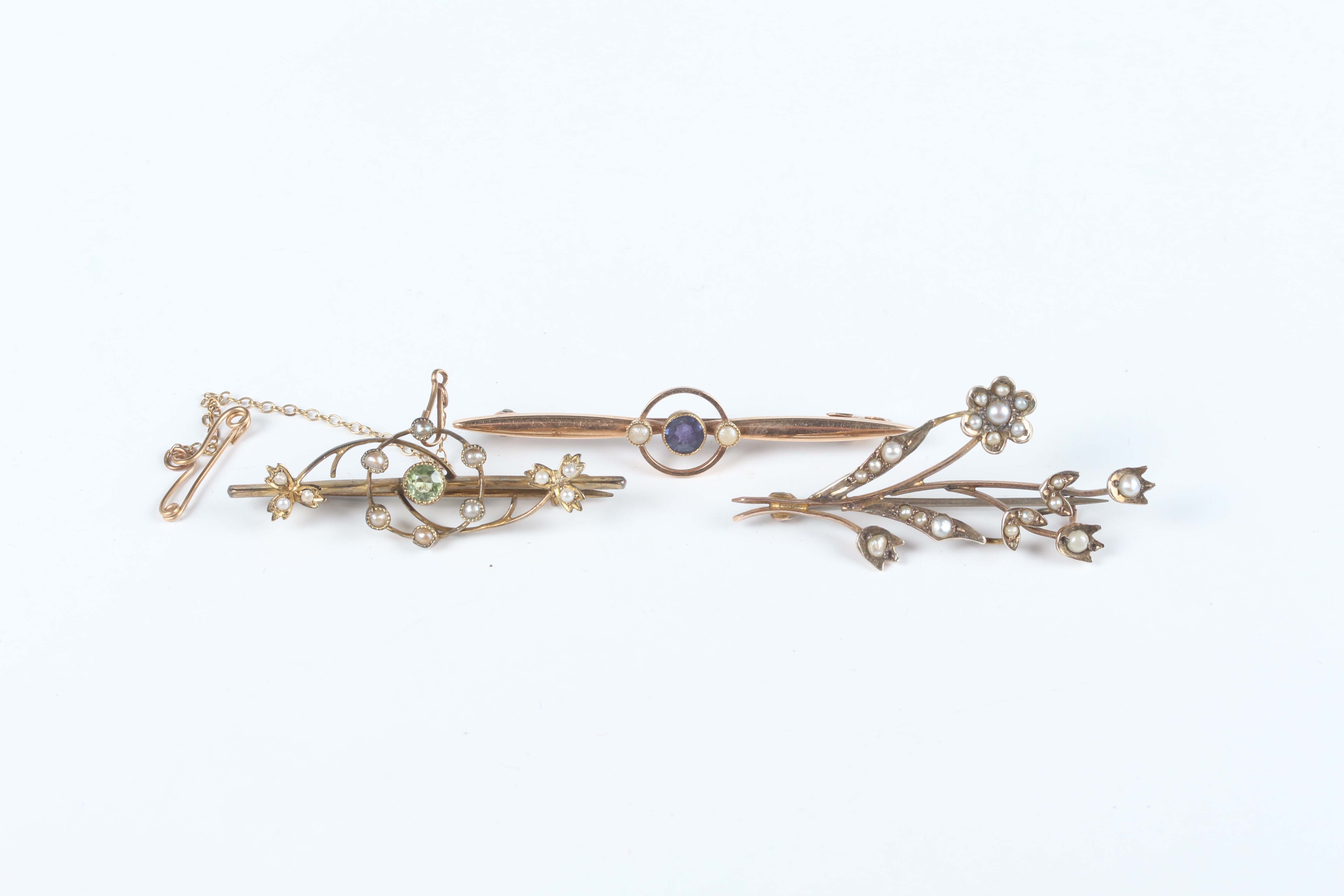 A gold, seed pearl and pale lilac gem set bar brooch, detailed ‘15ct’, weight 3.2g, width 5cm, a gold and seed pearl brooch in a floral spray design, detailed ‘9ct’, and a gold, peridot and seed pearl brooch, indistinct marks, total weight 6.1g.