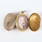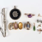 A gold bar brooch, mounted with a hexagonal cut amethyst within a surround of six seed pearls, weight 5.2g, width 4cm, two pendants, comprising a garnet set dragonfly and a sapphire set dolphin, two further pendants, two pairs of earstuds (one butterfly lacking), a lady’s wristwatch and two Victorian oval pendant lockets.