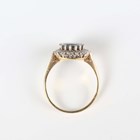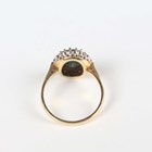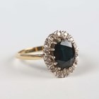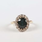 An 18ct gold, green gemstone and diamond oval cluster ring, claw set with the oval cut green gemstone within a surround of circular cut diamonds, weight 5g, ring size approx R1/2, with a case.