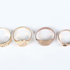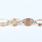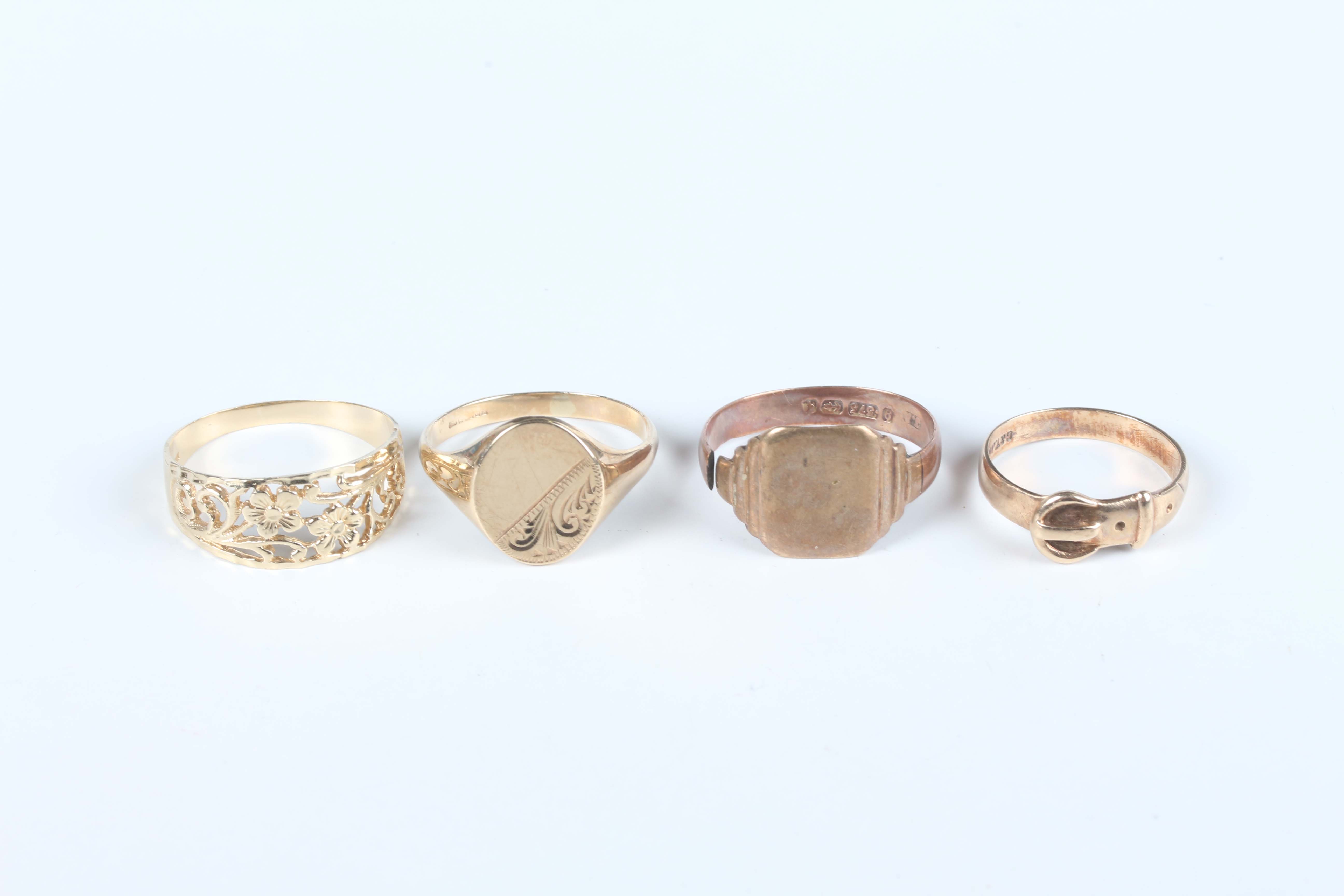A 9ct gold oval signet ring with engraved decoration, ring size approx T, a 9ct gold signet ring (shank split), a 9ct gold ring in a buckle and strap design, London 1982, and a 9ct gold ring with floral pierced decoration, total weight 9.7g.