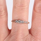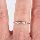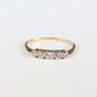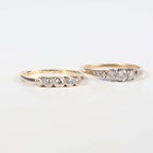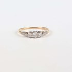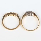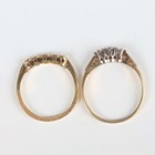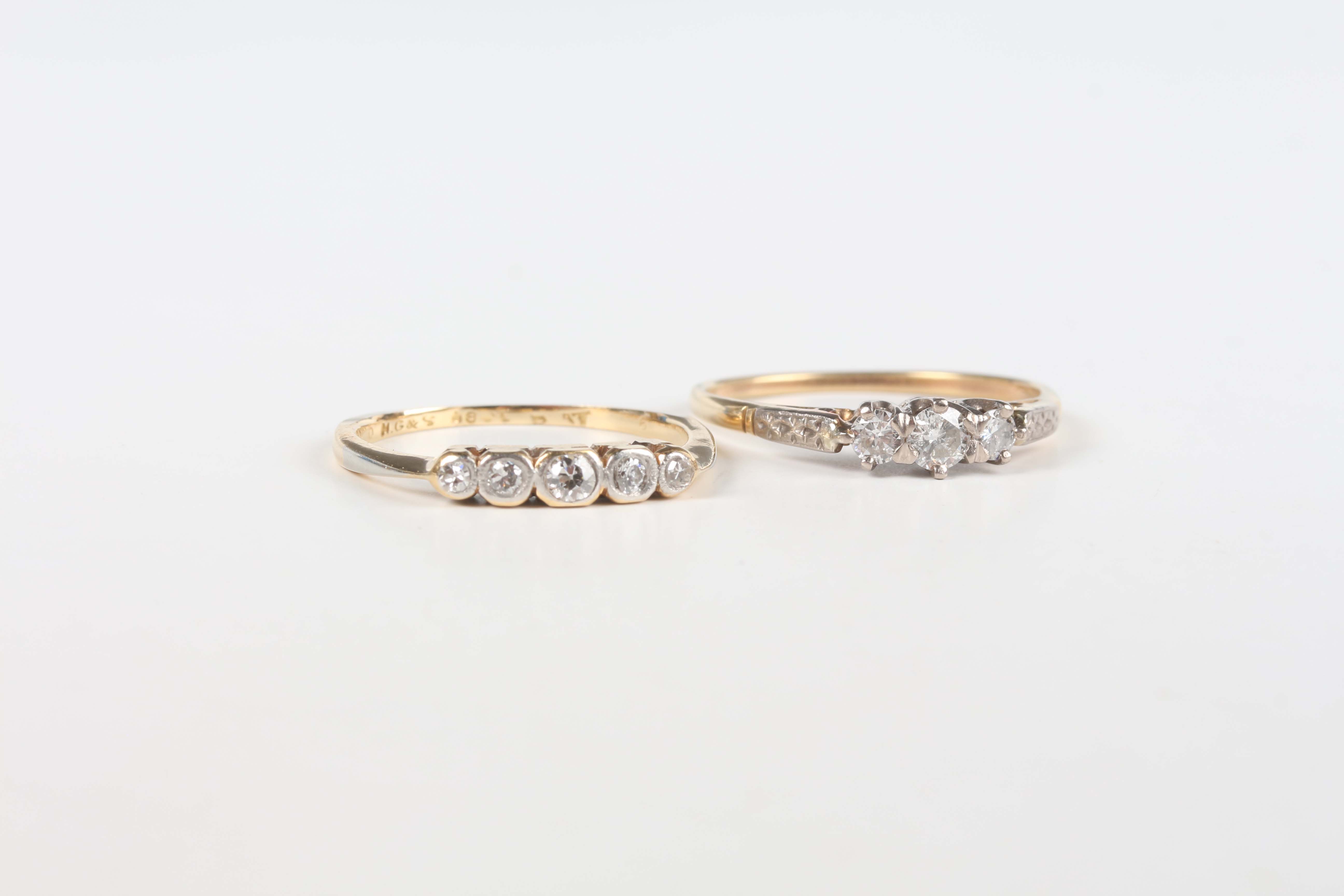 A gold, platinum and diamond five stone ring, mounted with a row of graduated cushion shaped diamonds, detailed ‘18ct PLAT’, weight 2.2g, ring size approx O1/2, and a gold and diamond three stone ring, claw set with a row of circular cut diamonds, unmarked, weight 2.4g, ring size approx R1/2.