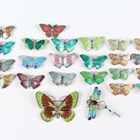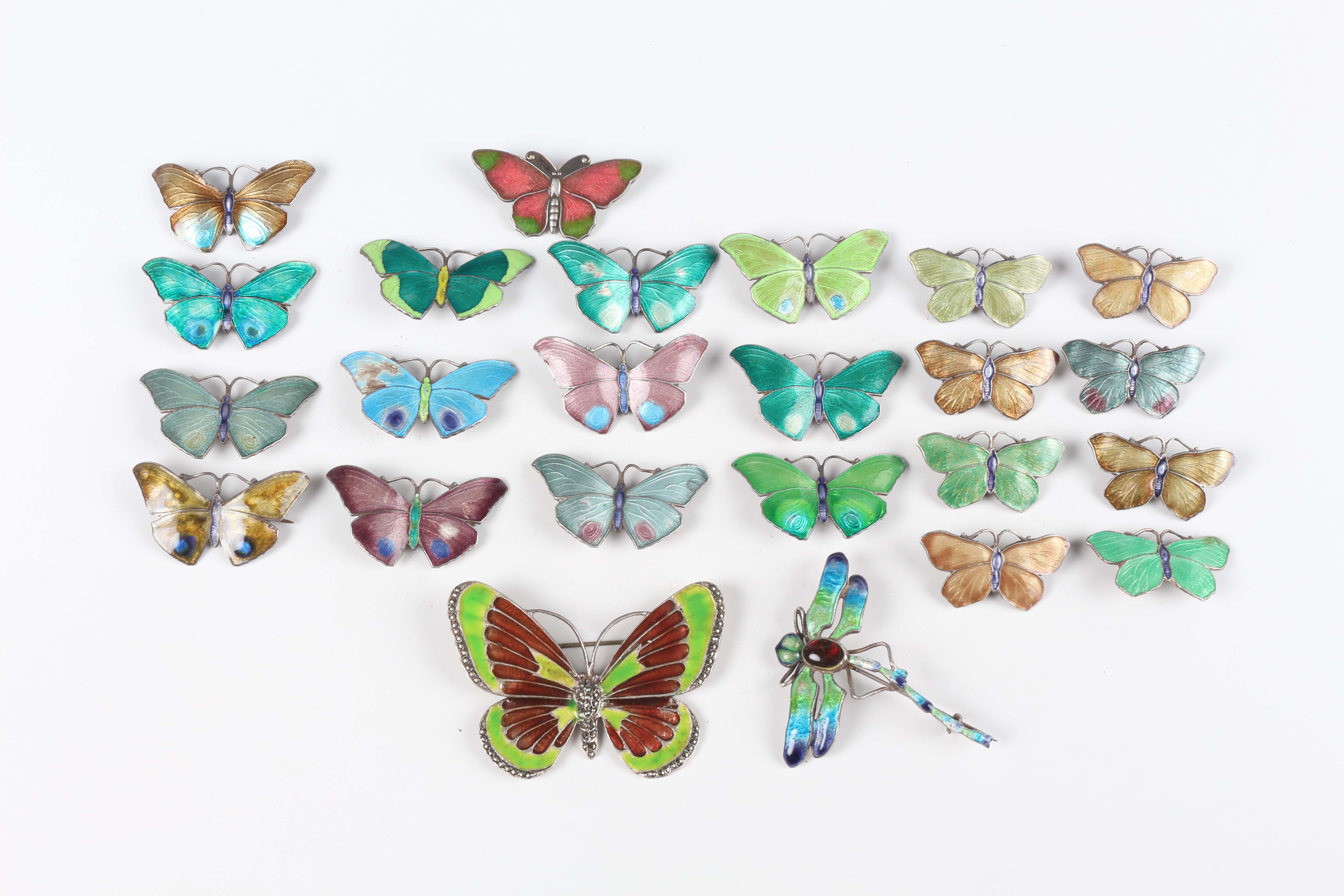 A sterling and enamelled dragonfly brooch, width 4.5cm, a sterling, enamelled and marcasite butterfly brooch, width 5.3cm, twenty-one sterling and enamelled smaller butterfly brooches in a variety of colours and designs, and another enamelled butterfly brooch, unmarked.