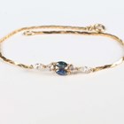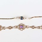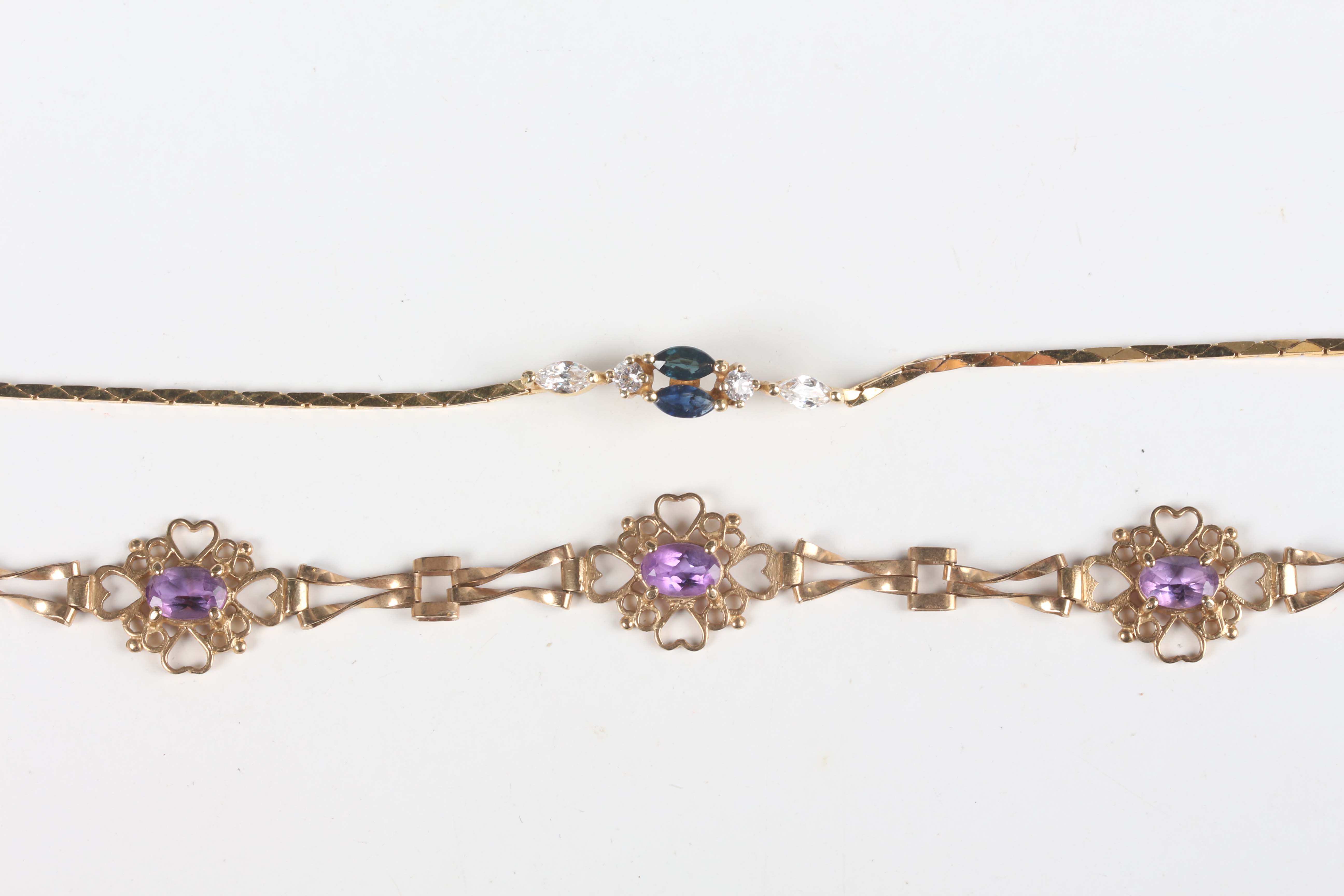 A 9ct gold and amethyst bracelet, claw set with three oval cut amethysts, length 18.5cm, and a 9ct gold bracelet, claw set with two marquise shaped sapphires between two pairs of colourless gems, length 18cm, total weight 6.8g.