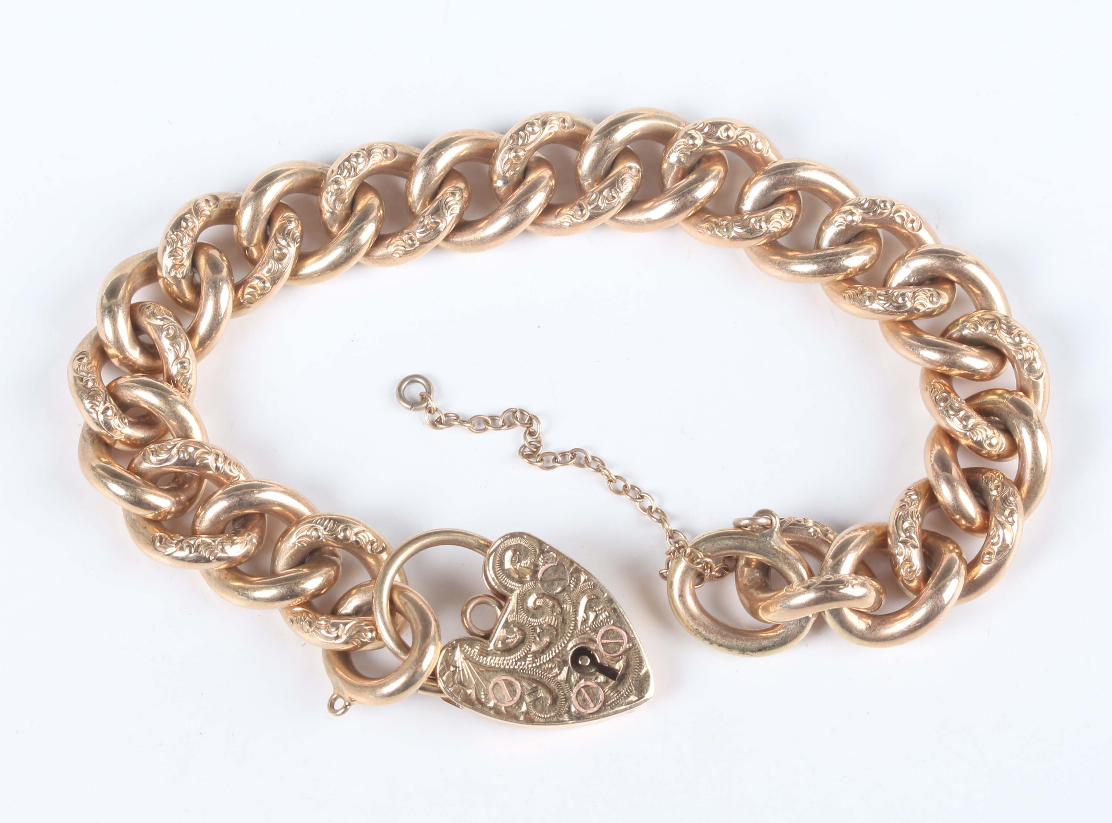 A 9ct gold decorated and plain curblink bracelet on a 9ct gold heart shaped padlock clasp with engraved decoration, total weight 62.2g, length 18.3cm.