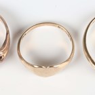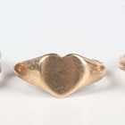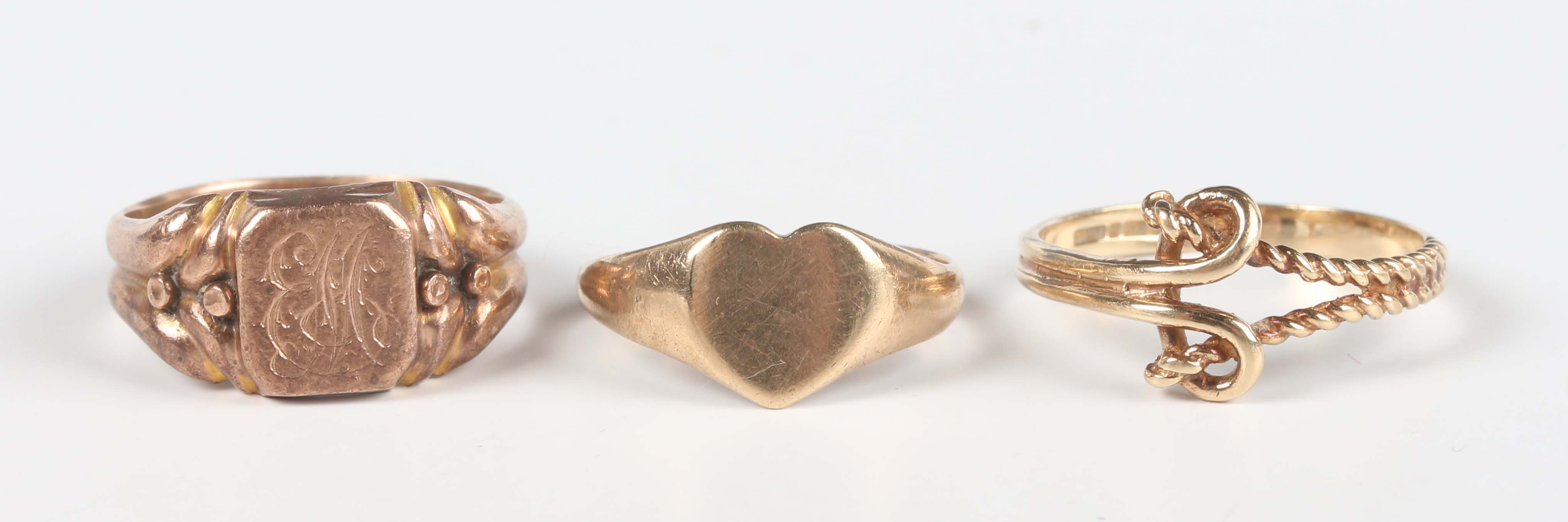 A late Victorian 9ct gold signet ring, monogram engraved, Chester 1900, ring size approx L1/2, a 9ct gold heart shaped signet ring, London 1963, ring size approx I, and a 9ct gold ring in an entwined design, ring size approx O, total weight 7.6g.