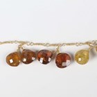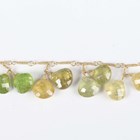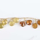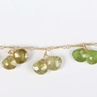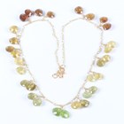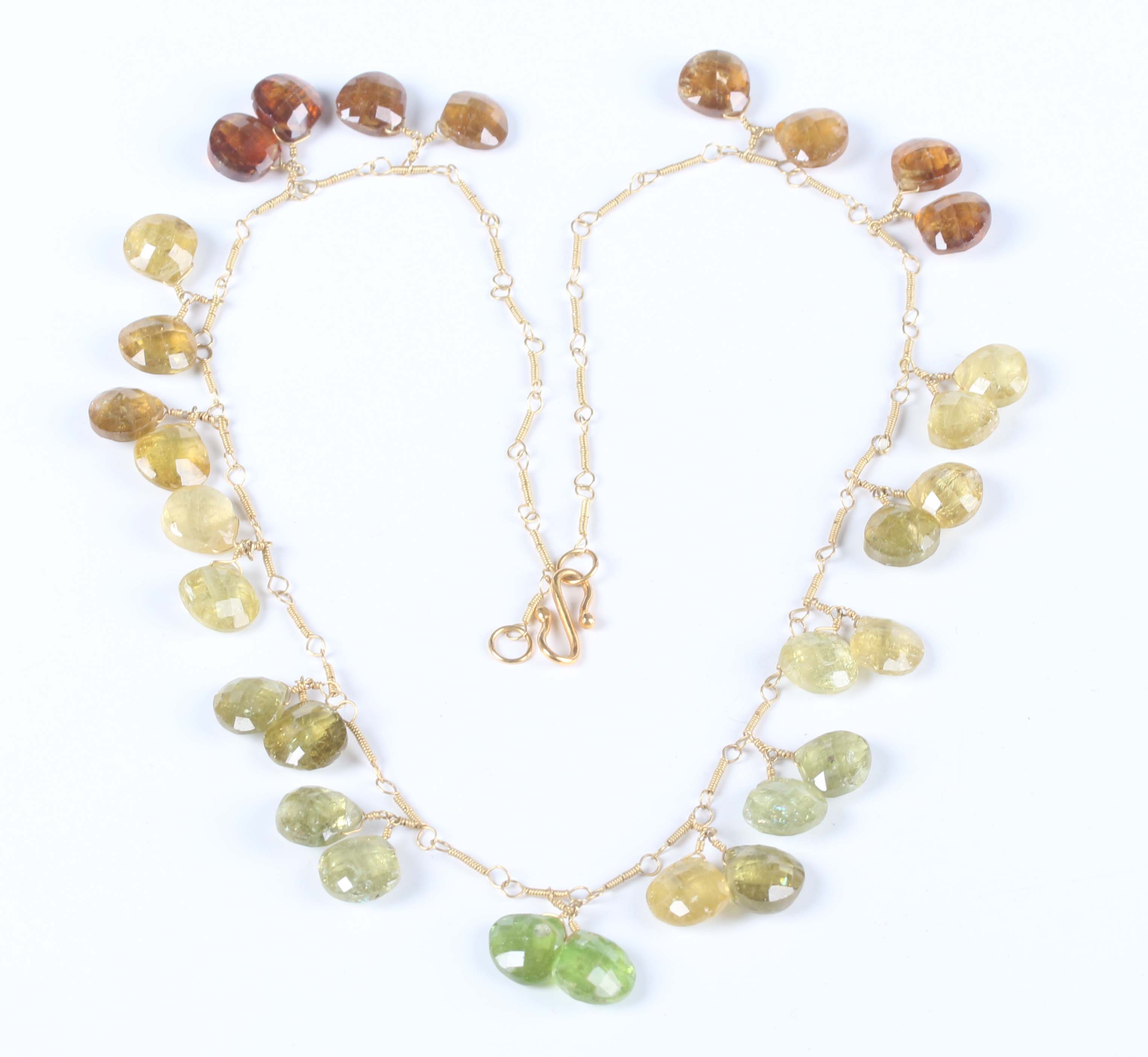 A gold and varicoloured green and brown garnet necklace, formed as a twisted wirework neckchain, mounted with fifteen pairs of faceted garnet pendant drops, on an 'S' shaped hook clasp, probably Asian, weight 24.8g, length 44cm.