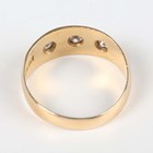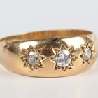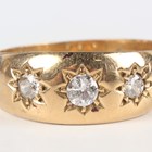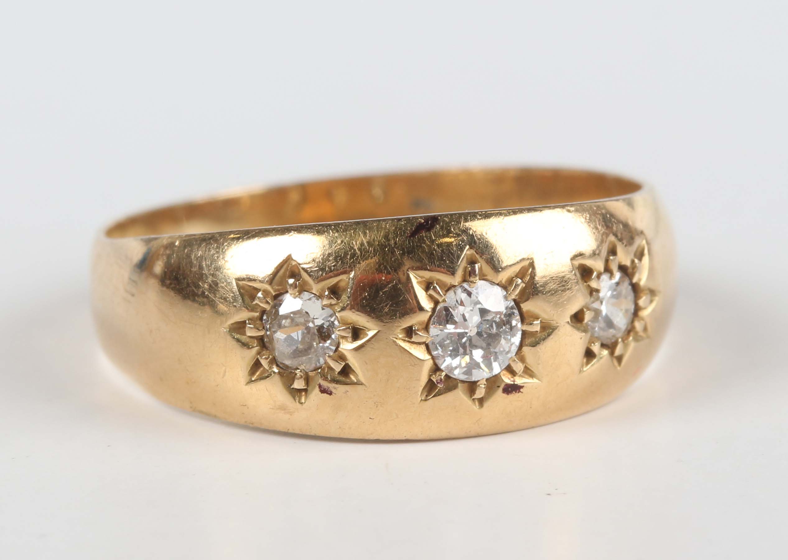 An 18ct gold and diamond three stone ring, star set with graduated circular cut diamonds, weight 3.5g, ring size approx O, cased.