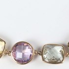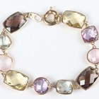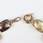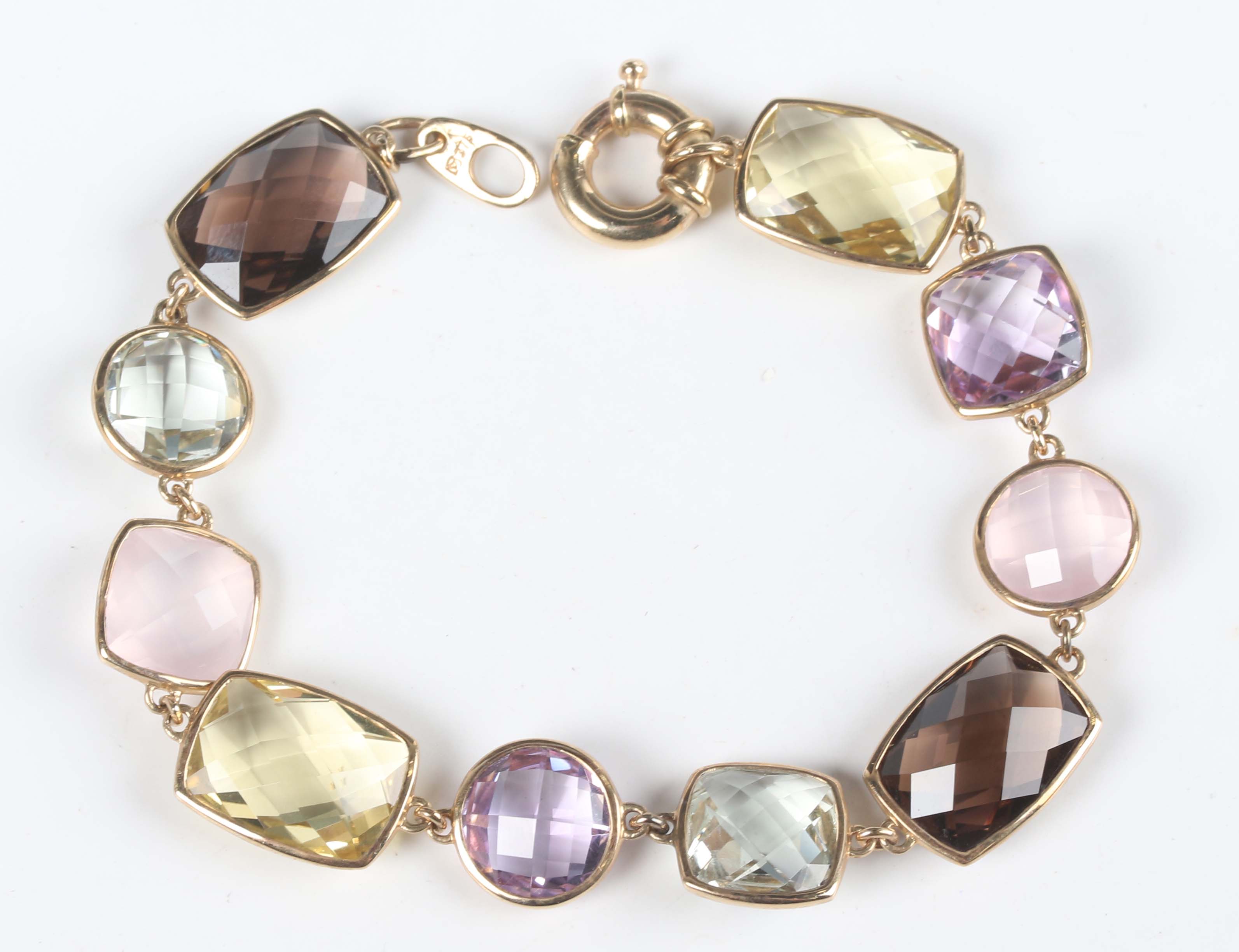 A 9ct gold and varicoloured gemstone bracelet, spectacle set with rose quartz, citrines, smoky quartz and amethysts, on a boltring clasp, weight 14.1g, length 18.5cm.