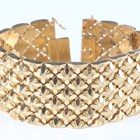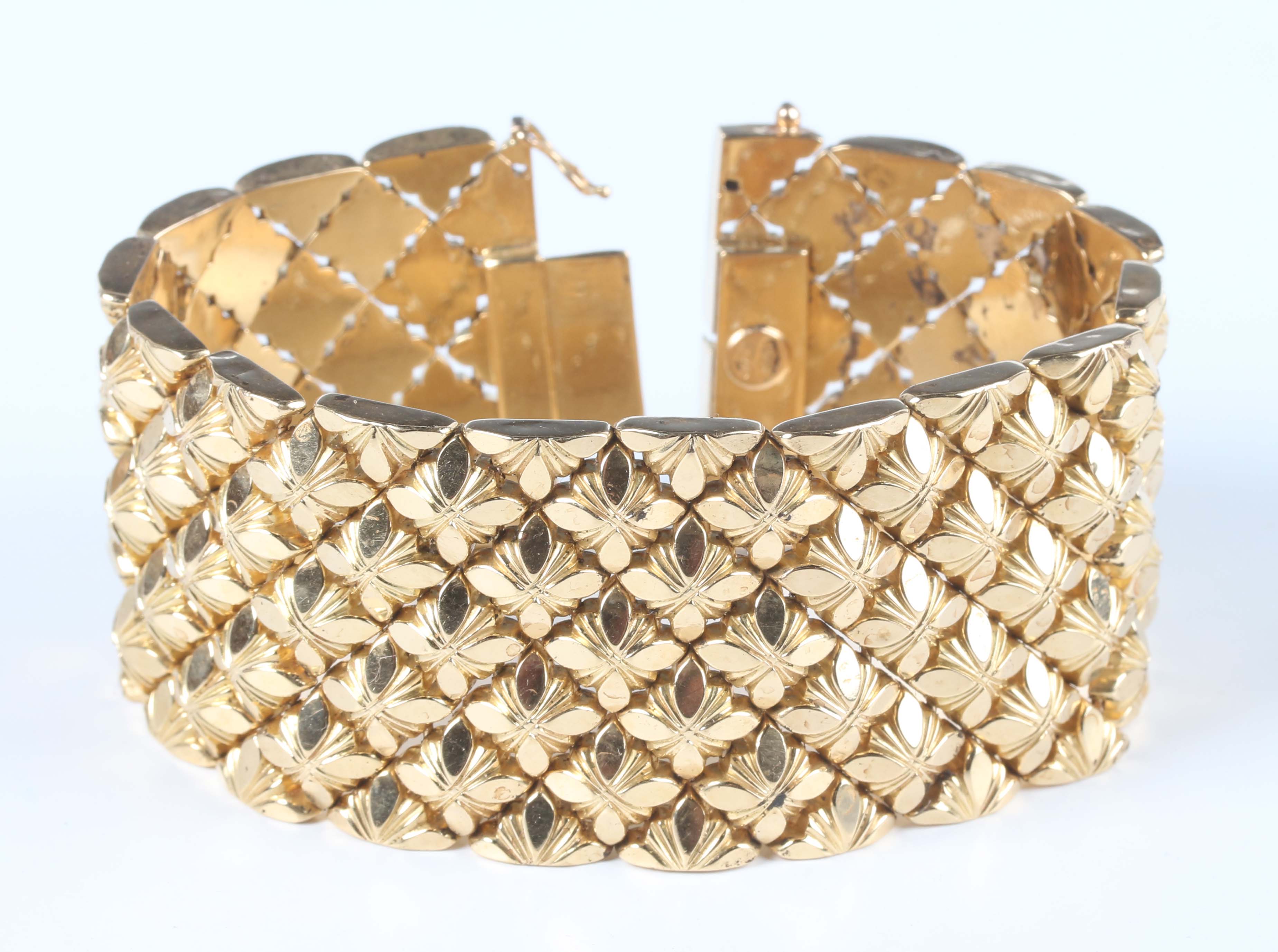 An Italian gold wide bracelet in a square foliate link design, on a snap clasp, detailed '750', weight 84.1g, length 20cm, width 3.7cm.