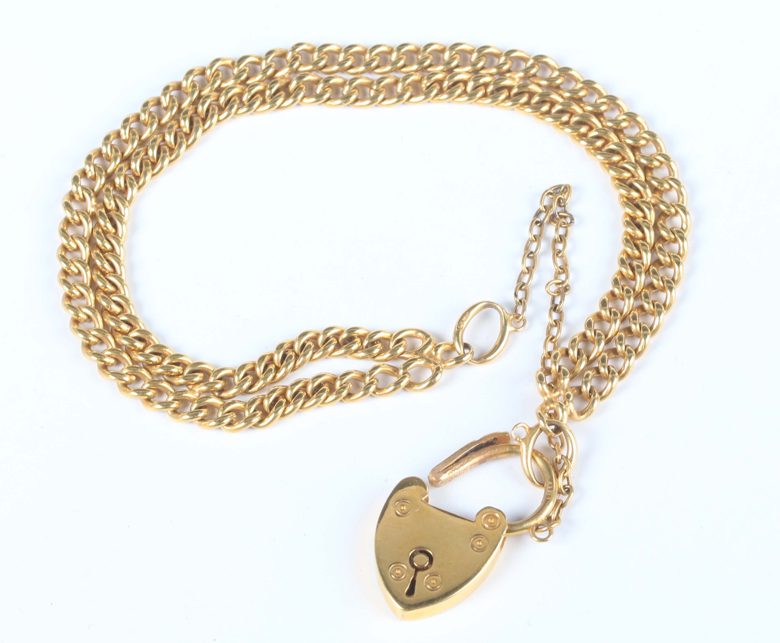 An 18ct gold two row curblink bracelet on an 18ct gold heart shaped padlock clasp, total weight 29.3g, length 20cm.