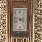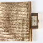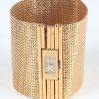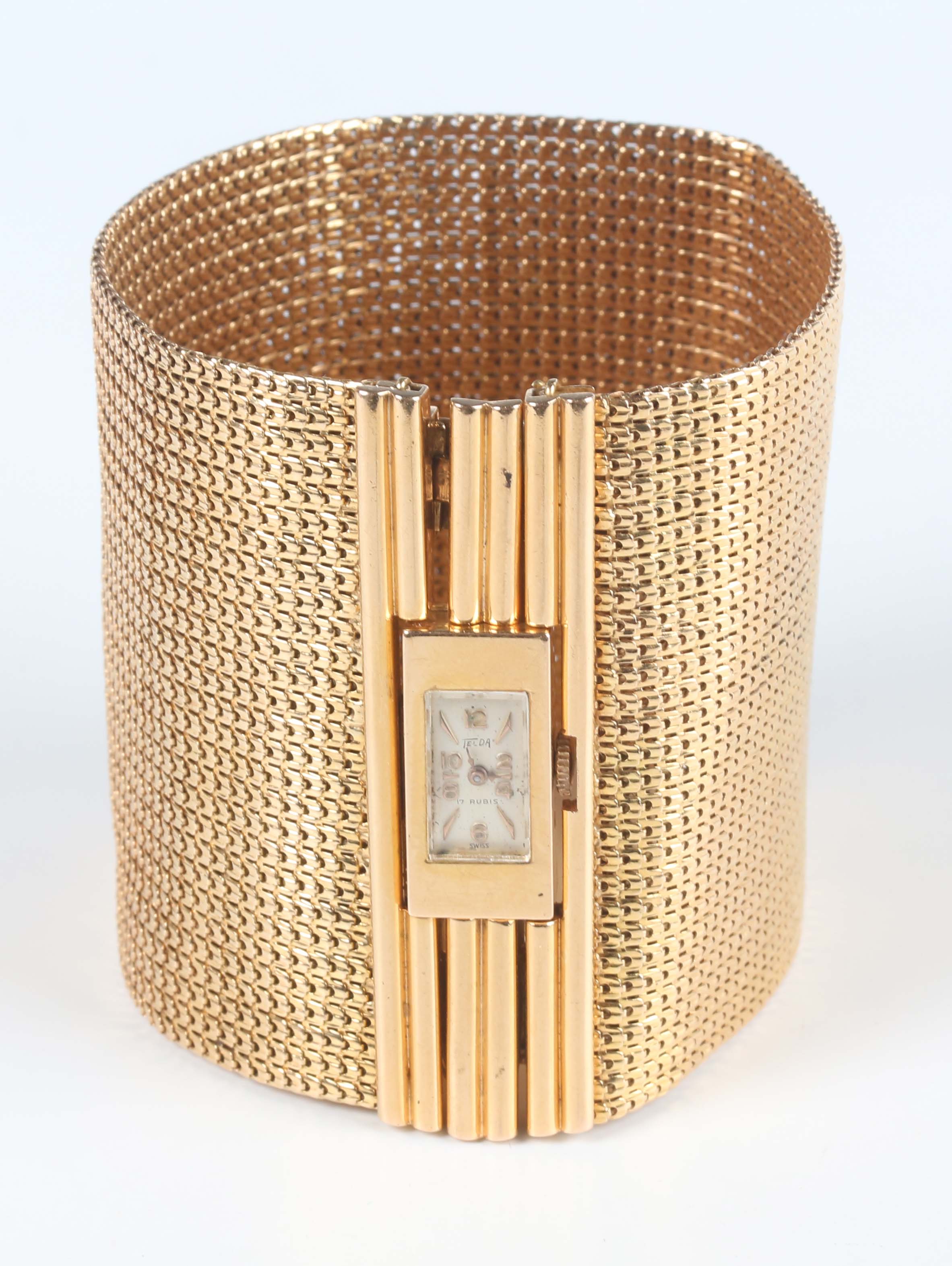 A French gold wide mesh link bracelet wristwatch, the clasp fitted with a Telda rectangular lady's wristwatch, the signed dial with Arabic numerals, on a twin snap clasp, bearing eagle head marks, total weight 109g, length 18.5cm, width 5.7cm, width of watch case 1.1cm.