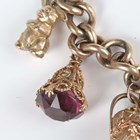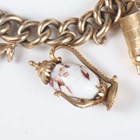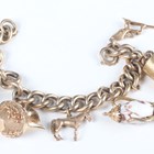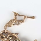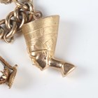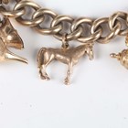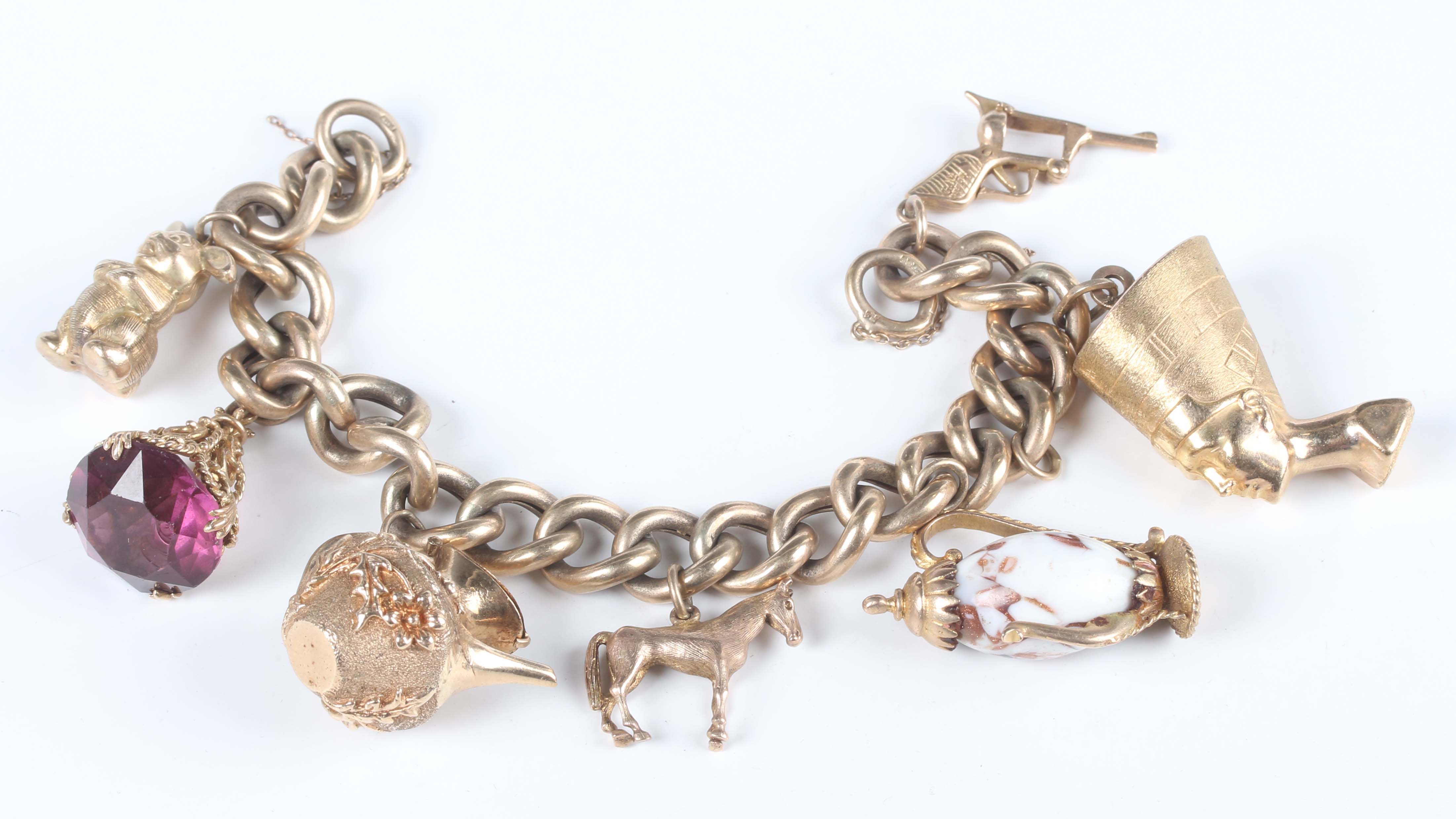 A 9ct gold curblink bracelet, fitted with six 9ct gold charms, comprising a pharaoh's head, a rabbit, a gun, a horse, a fob and a teapot, together with a coffee pot charm, unmarked, total weight 65.7g, length 18.5cm.