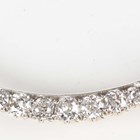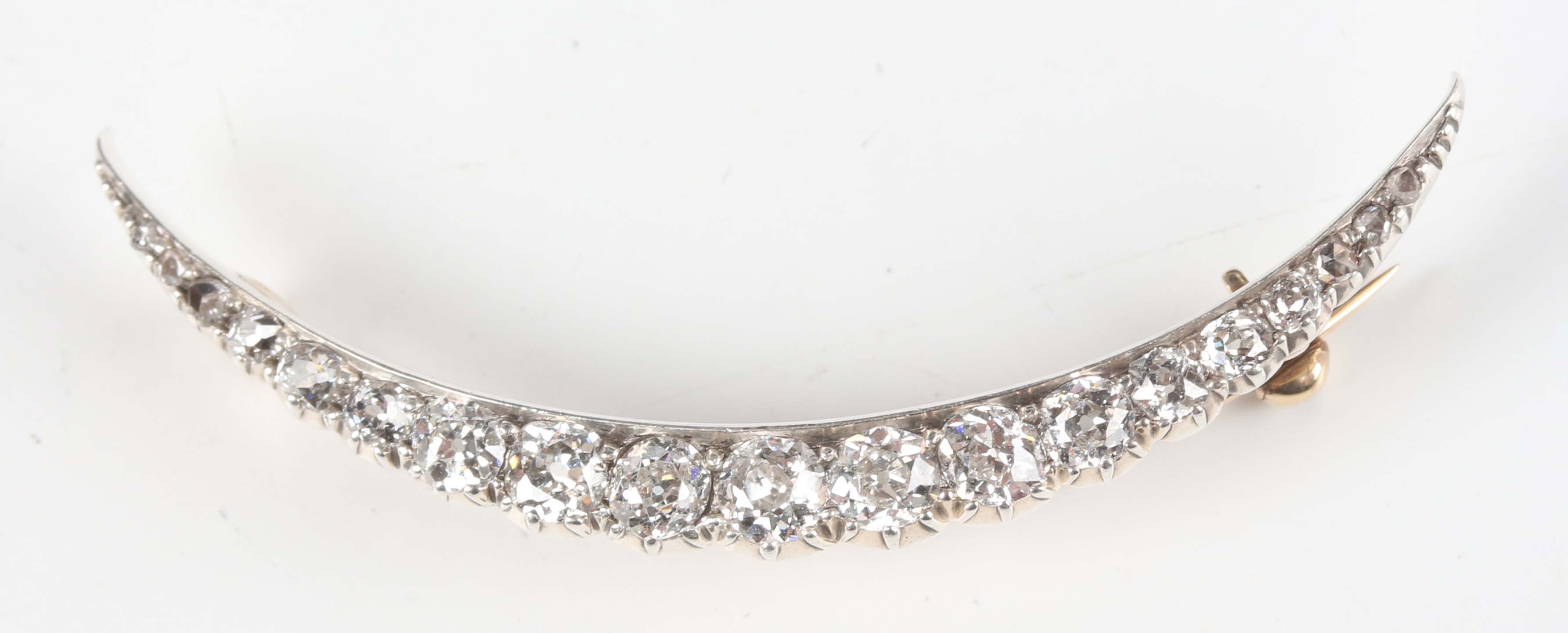 A gold, silver set and diamond crescent shaped brooch, claw set with a row of graduated circular and rose cut diamonds, unmarked, weight 3.5g, width 4.5cm.