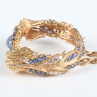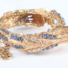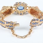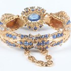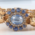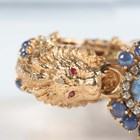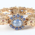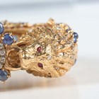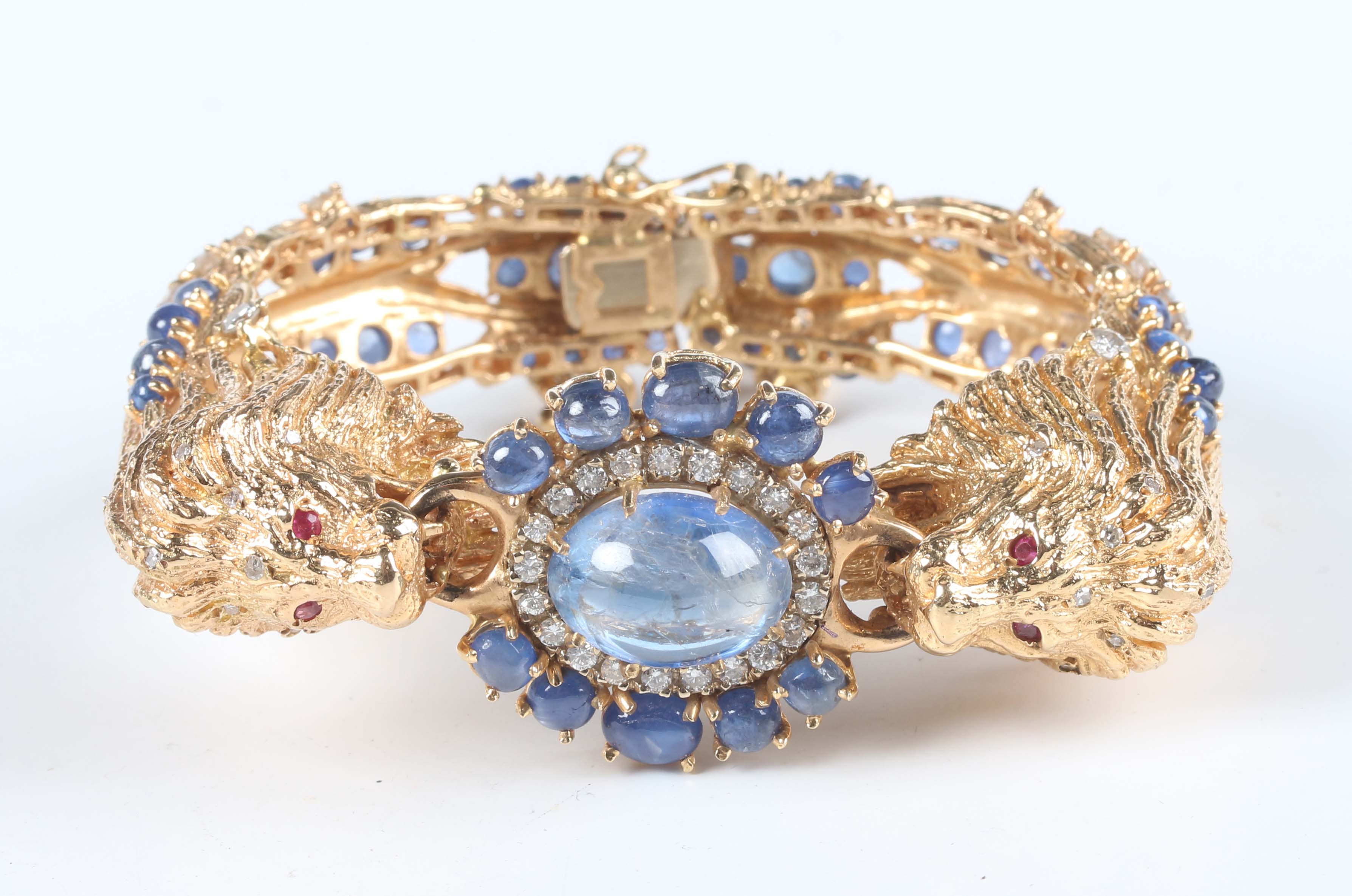 A gold, cabochon sapphire, ruby and diamond oval hinged bangle, the front with an oval cluster, mounted with a large oval cabochon sapphire within a surround of circular cut diamonds and an outer border of smaller cabochon sapphires, between two opposing lion masks with ruby set eyes, otherwise mounted with circular cut diamonds and cabochon sapphires, on a snap clasp, unmarked, weight 102g, inside width 5.8cm.