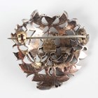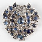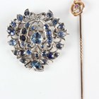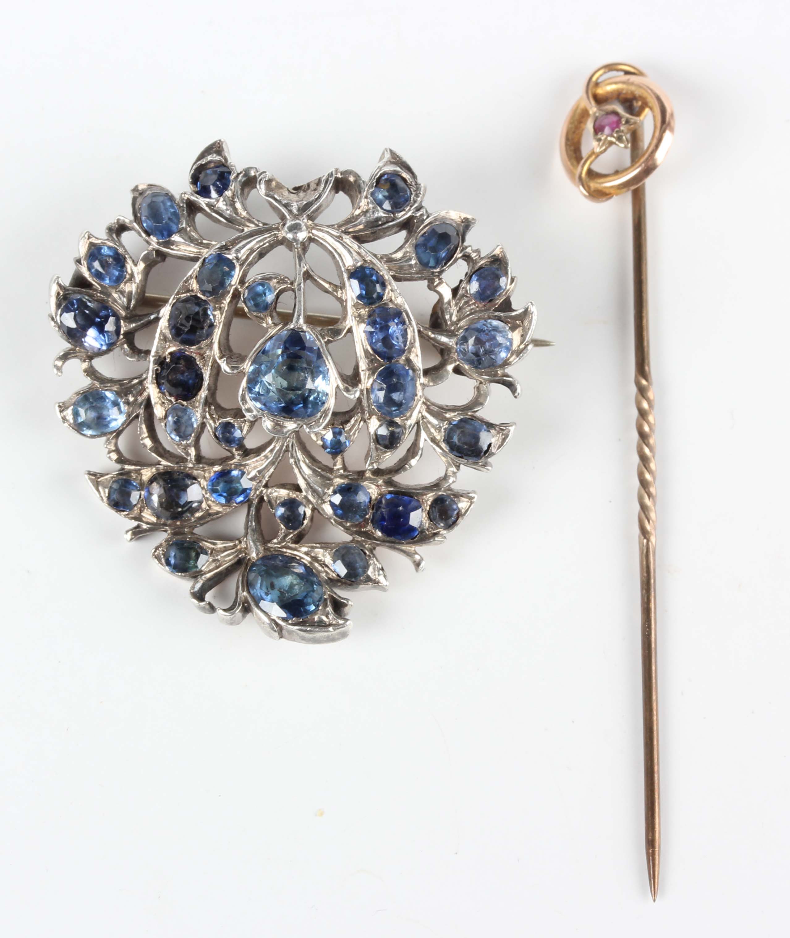 An Asian gold backed, silver set sapphire brooch in a foliate openwork design, mounted with variously cut sapphires, unmarked, weight 14g, width 3.3cm, and a gold topped stickpin, detailed ‘9c’.