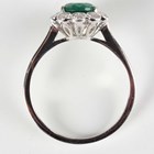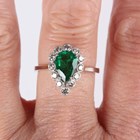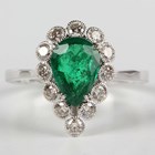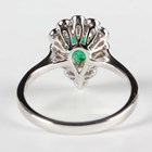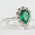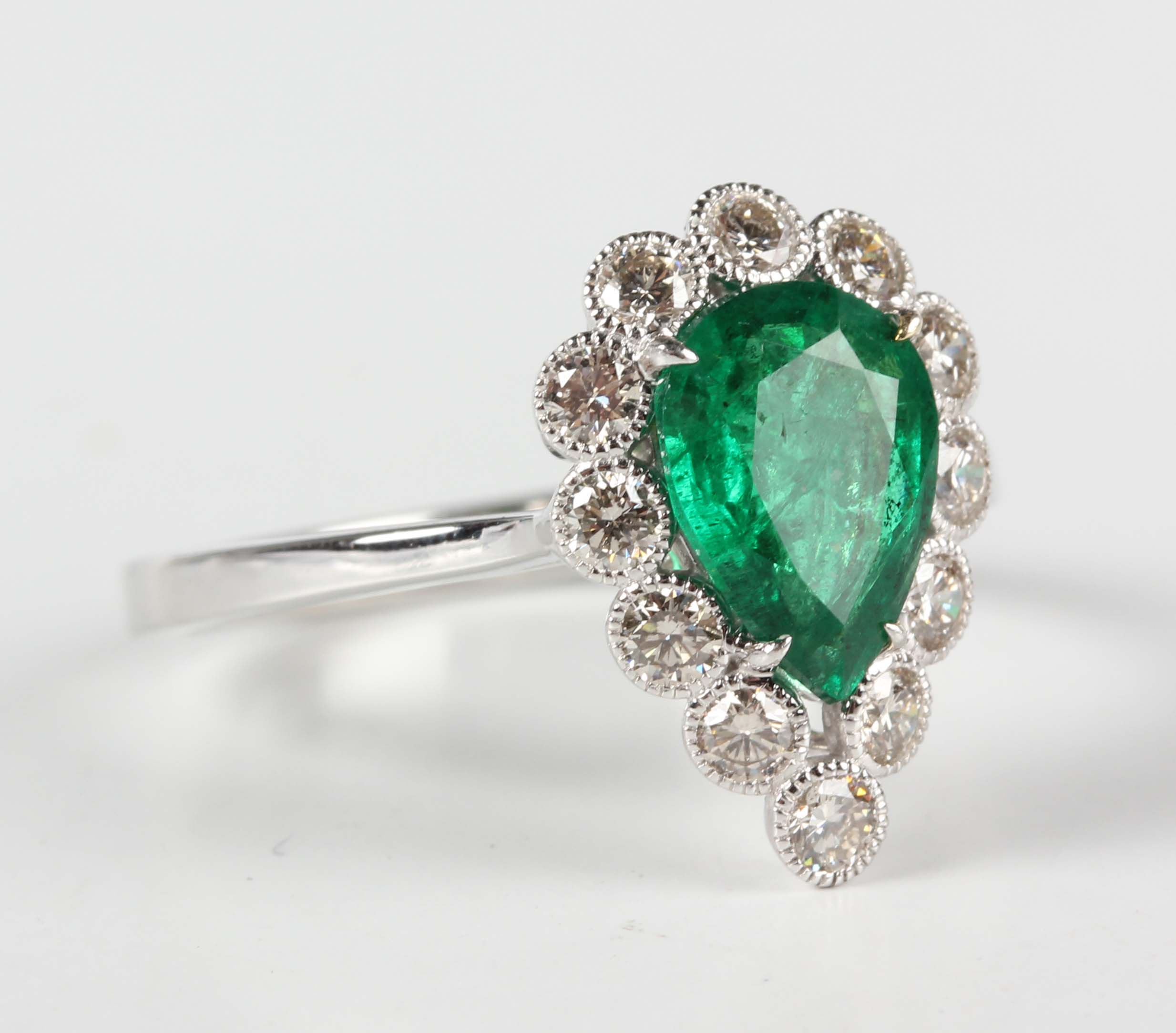 A white gold, emerald and diamond cluster ring, claw set with a pear shaped emerald within a surround of round brilliant cut diamonds, detailed '750', weight 4.1g, emerald weight approx 1.39ct, total diamond weight approx 0.56ct, ring size approx P1/2.