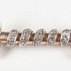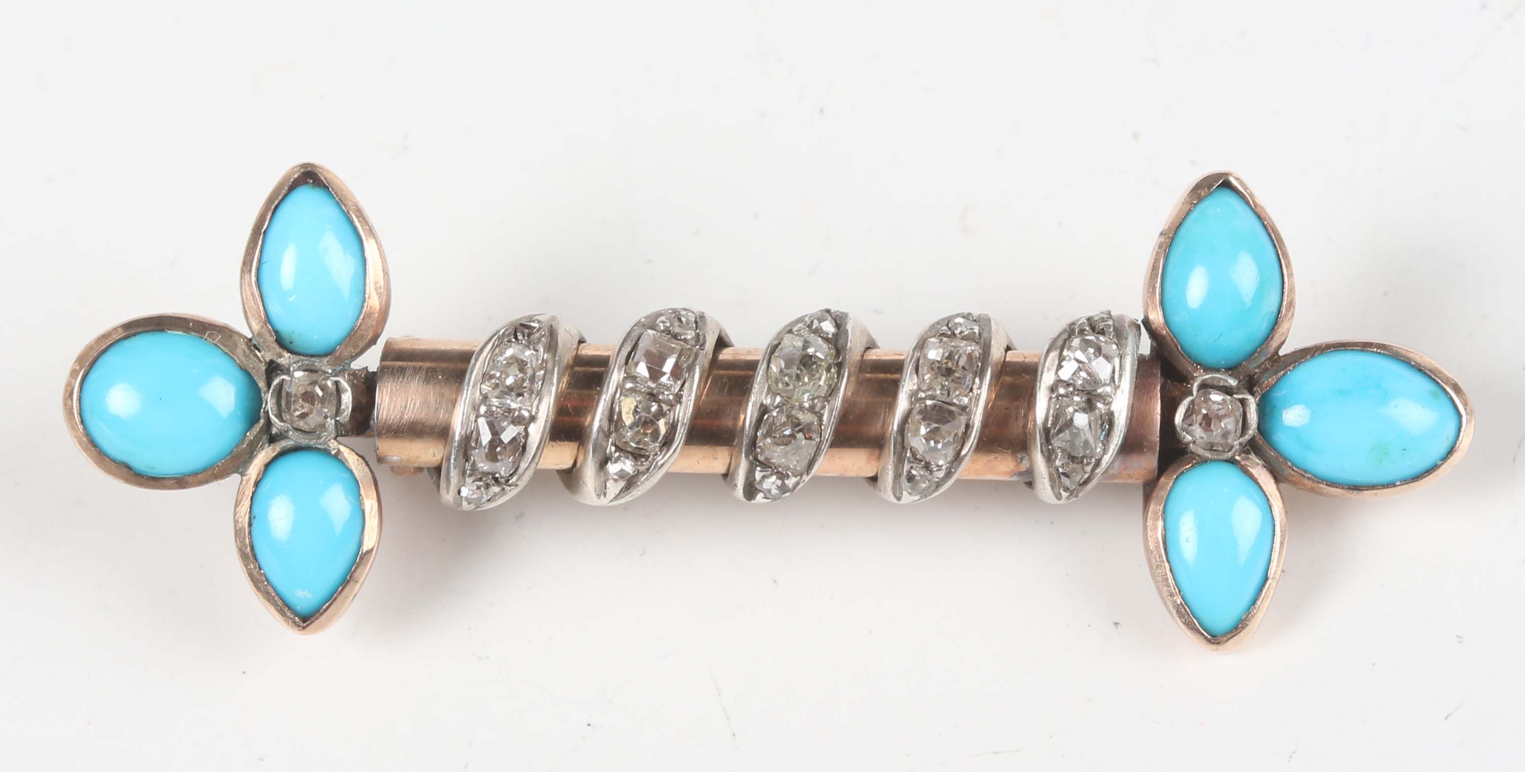 A gold, turquoise and diamond bar brooch, mounted with five rows of graduated rose cut diamonds between turquoise set trefoil terminals, unmarked, weight 4.1g, width 4.2cm.