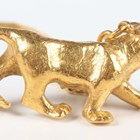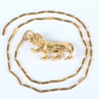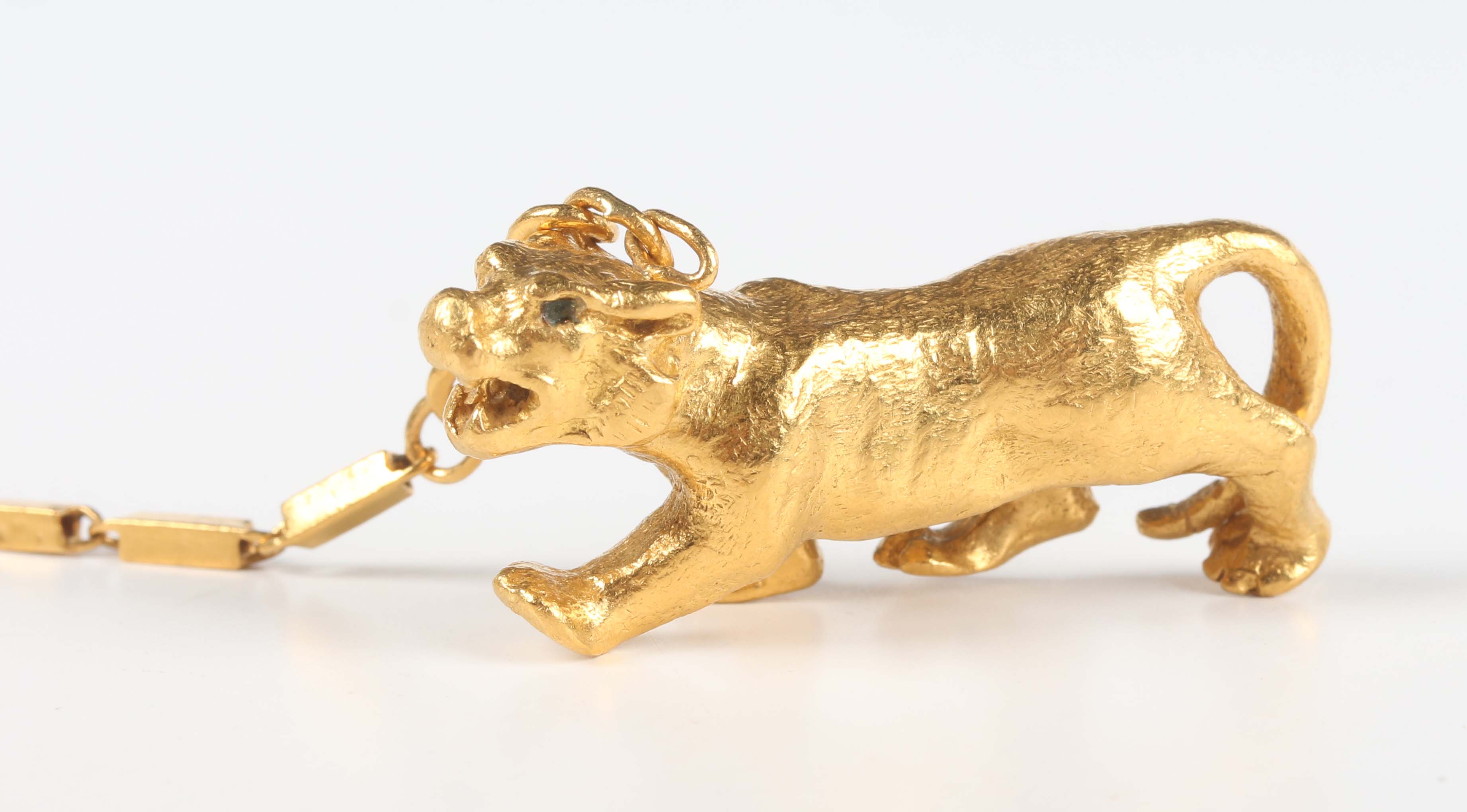 A Chinese gold pendant, designed as a tiger, impressed marks to the underside, weight 19.6g, length 4cm, fitted to a bar link neckchain on a serpentine clasp, weight 13.6g, length 42cm.