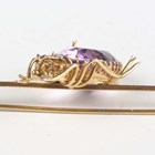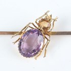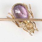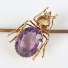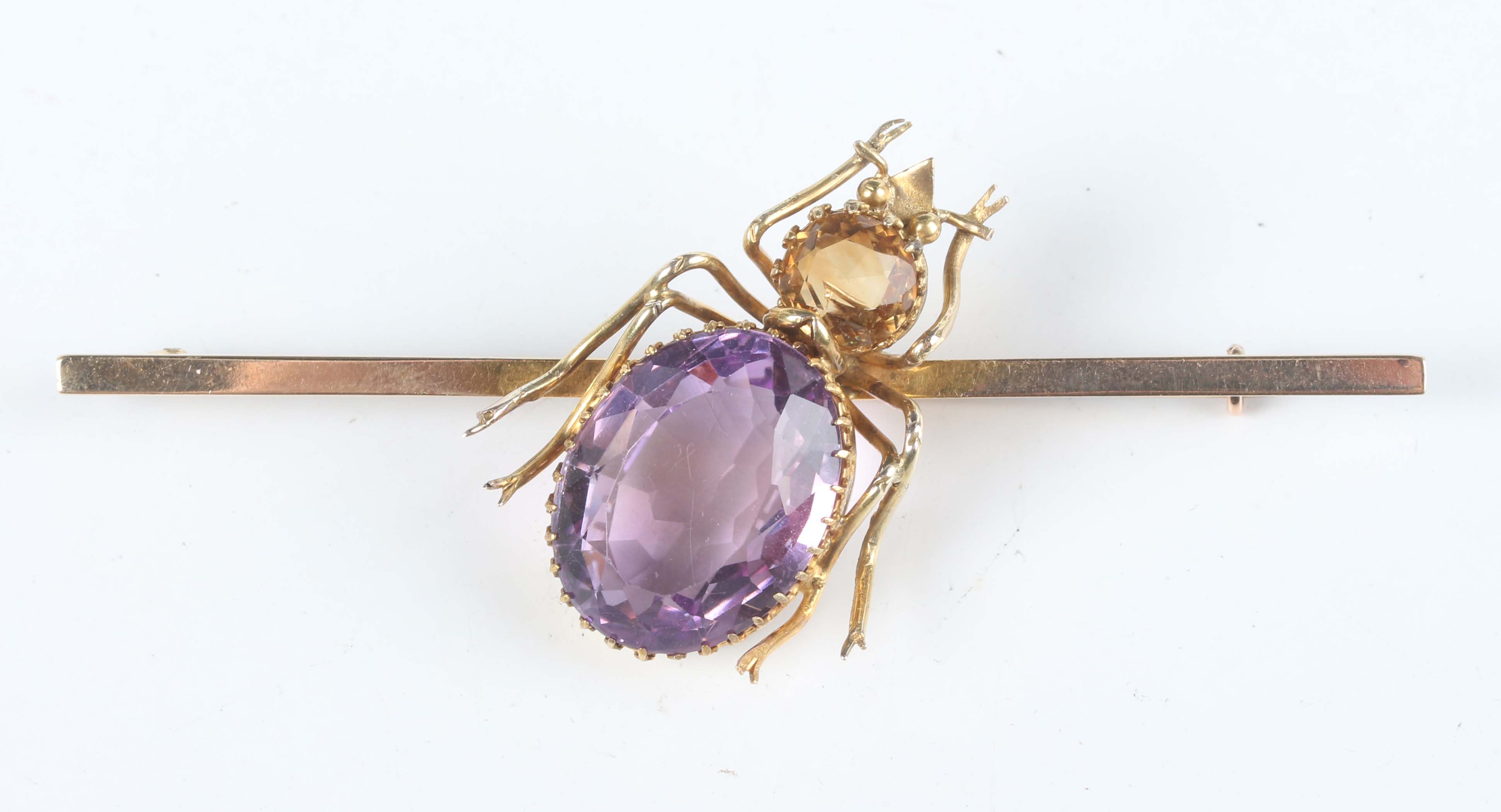 A gold, amethyst and citrine insect bar brooch, the centre mounted with a beetle, claw set with an oval cut amethyst body and a circular cut citrine head, detailed '9ct', weight 9.9g, width 7.7cm.