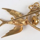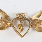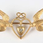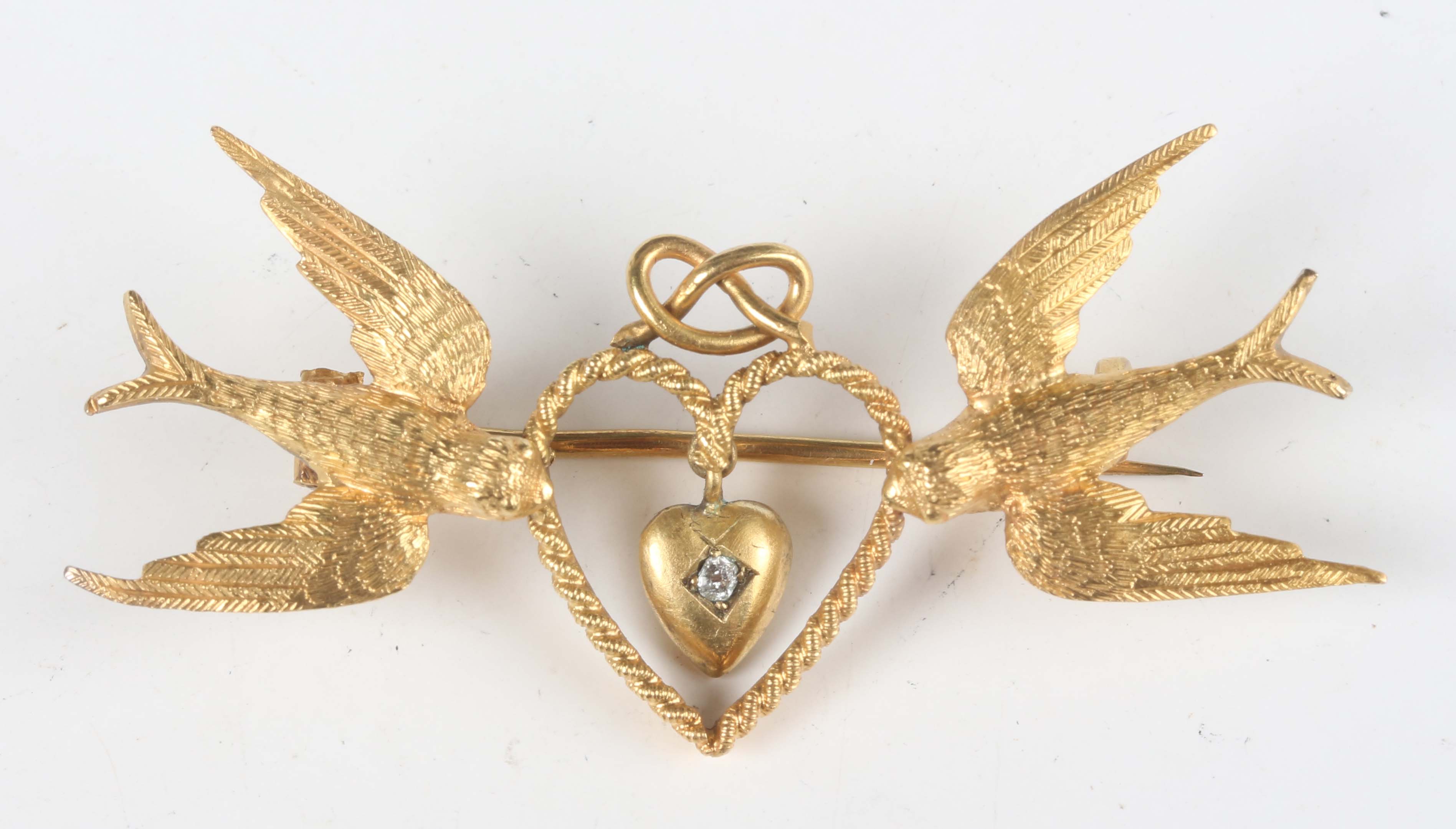 A gold and diamond brooch, designed as an open heart with a diamond set single stone pendant heart to the swing centre between two swallows, detailed '15ct', weight 4.1g, width 5cm.
