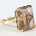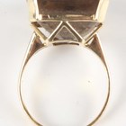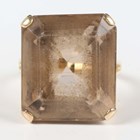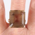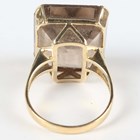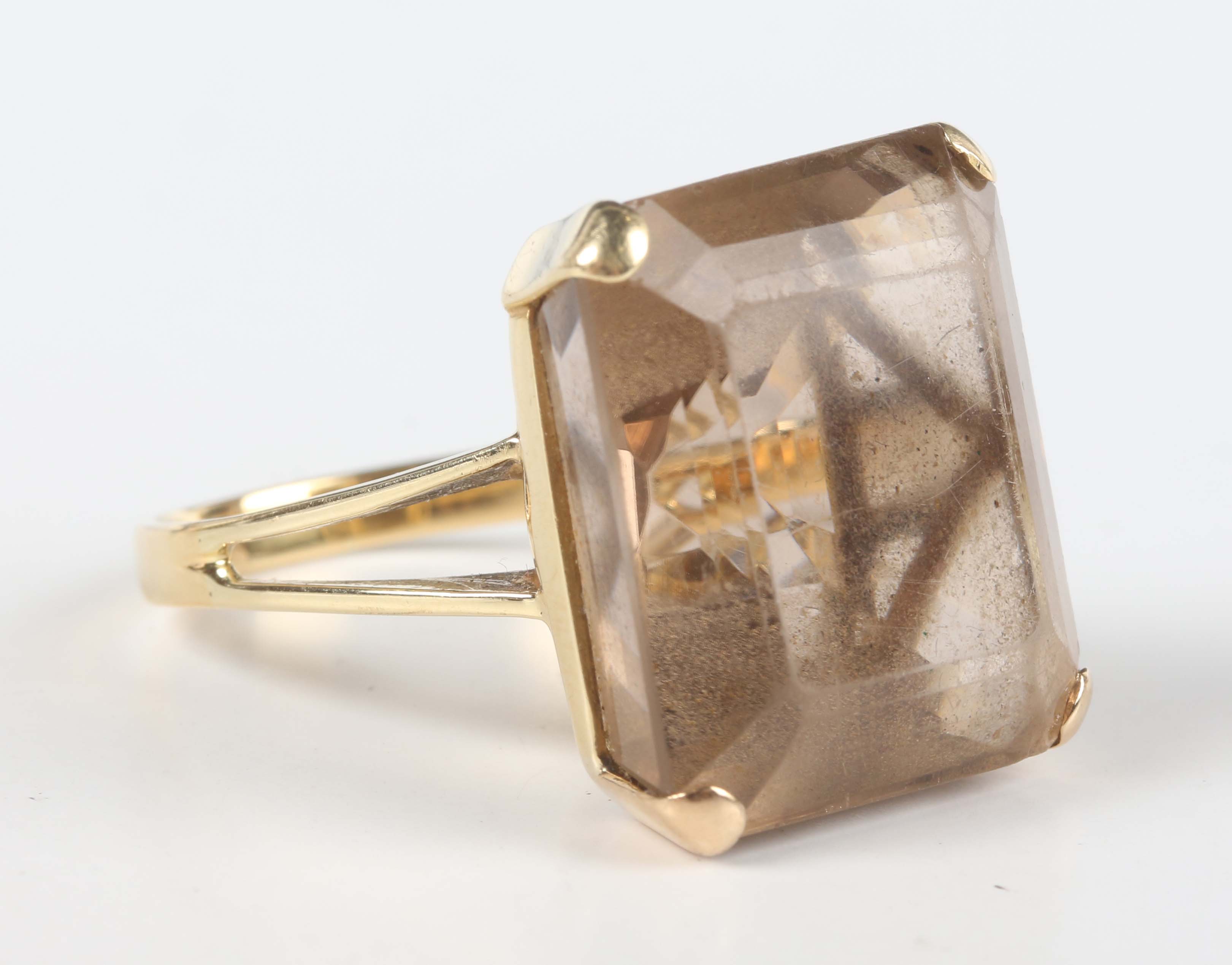 A gold ring, claw set with a cut cornered rectangular step cut smoky quartz, unmarked, weight 12.3g, ring size approx V.