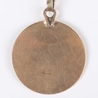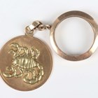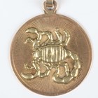 An Italian gold Scorpio pendant, detailed ‘750’, weight 9.6g, length 4cm, and a gold mounted circular pendant locket, unmarked, weight 4.5g, length 3.2cm.