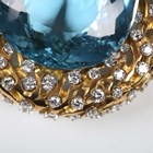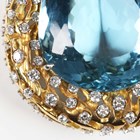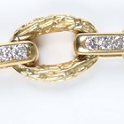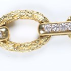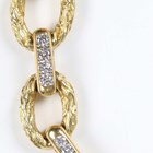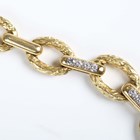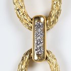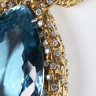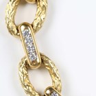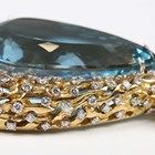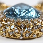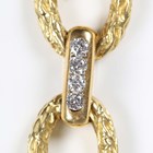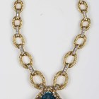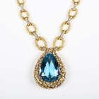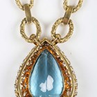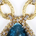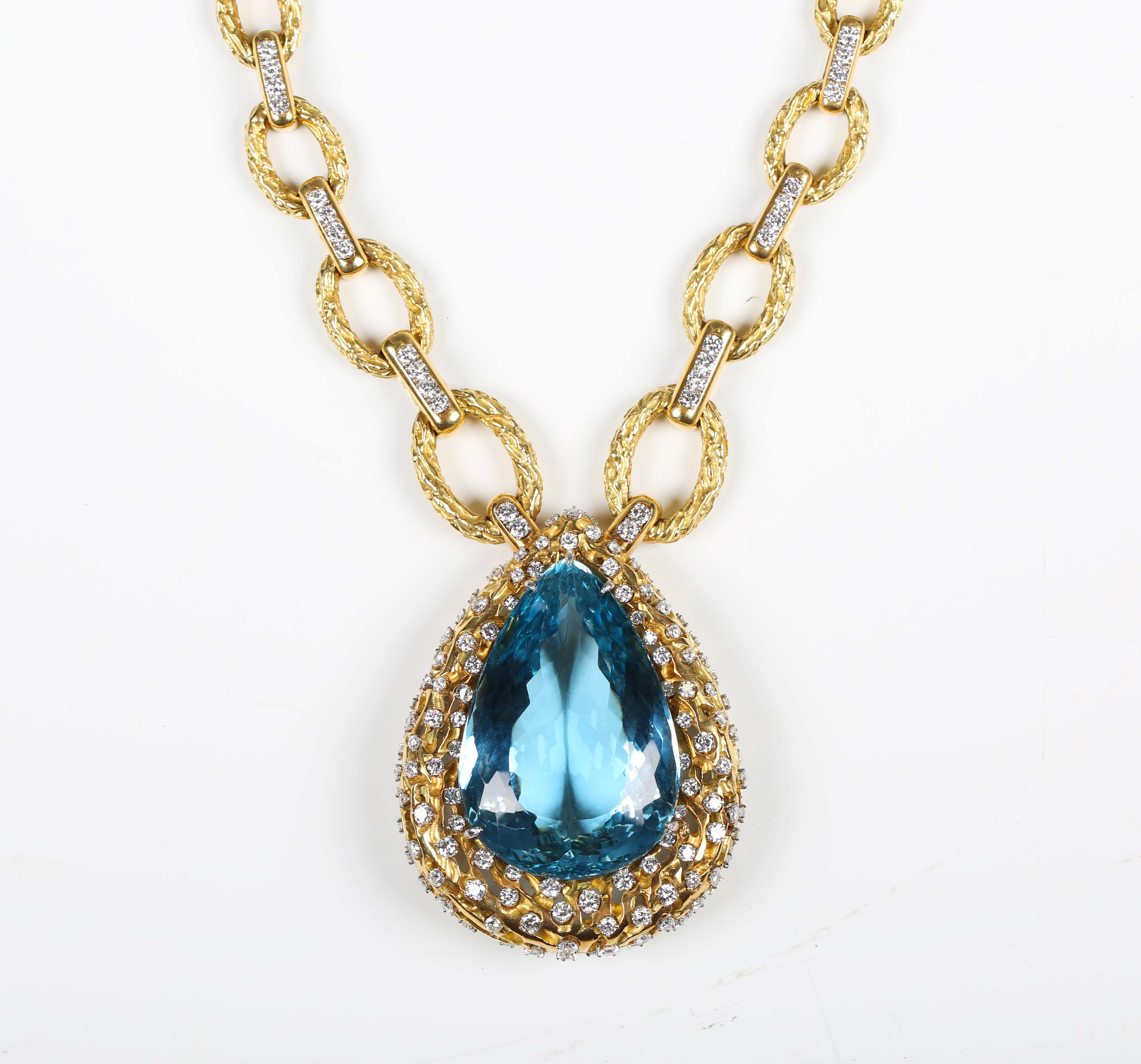 A gold, blue topaz and diamond pendant necklace, probably American, the front claw set with a large pear shaped blue topaz within a pierced pear shaped surround, mounted with circular cut diamonds, on a graduated oval textured link chain alternating with diamond four stone set links, on a folding clasp, one link detailed '10% Irid Plat', total weight 458.5g, length of topaz 6cm, total length of pendant 8.3cm, width of pendant 6.5cm, length of chain 48.5cm.