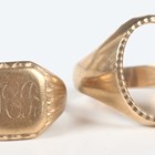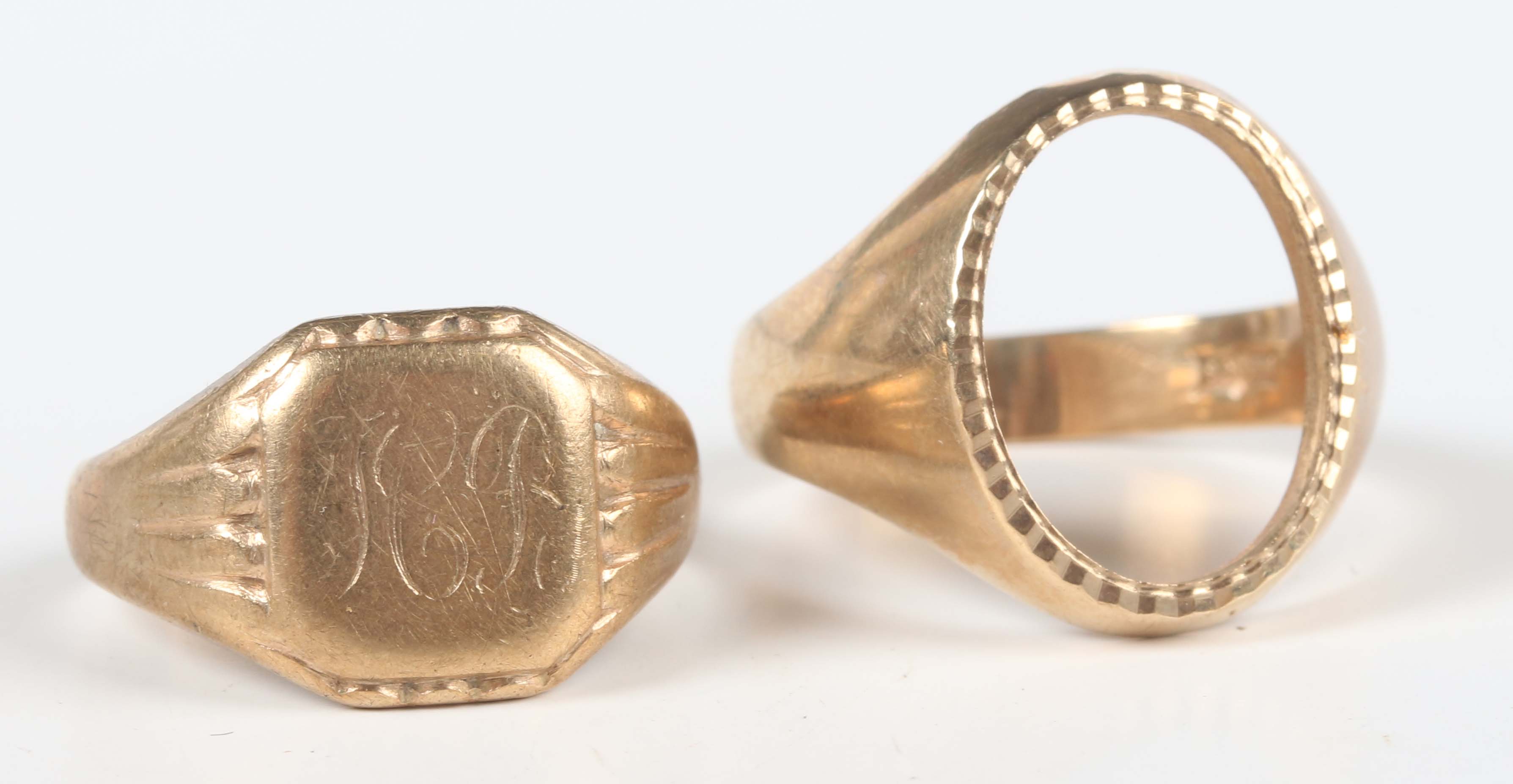 A 9ct gold signet ring, initial engraved, and a 9ct gold oval signet ring mount, total weight 14.2g.