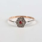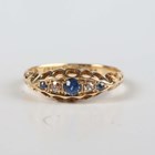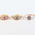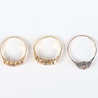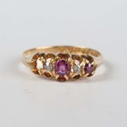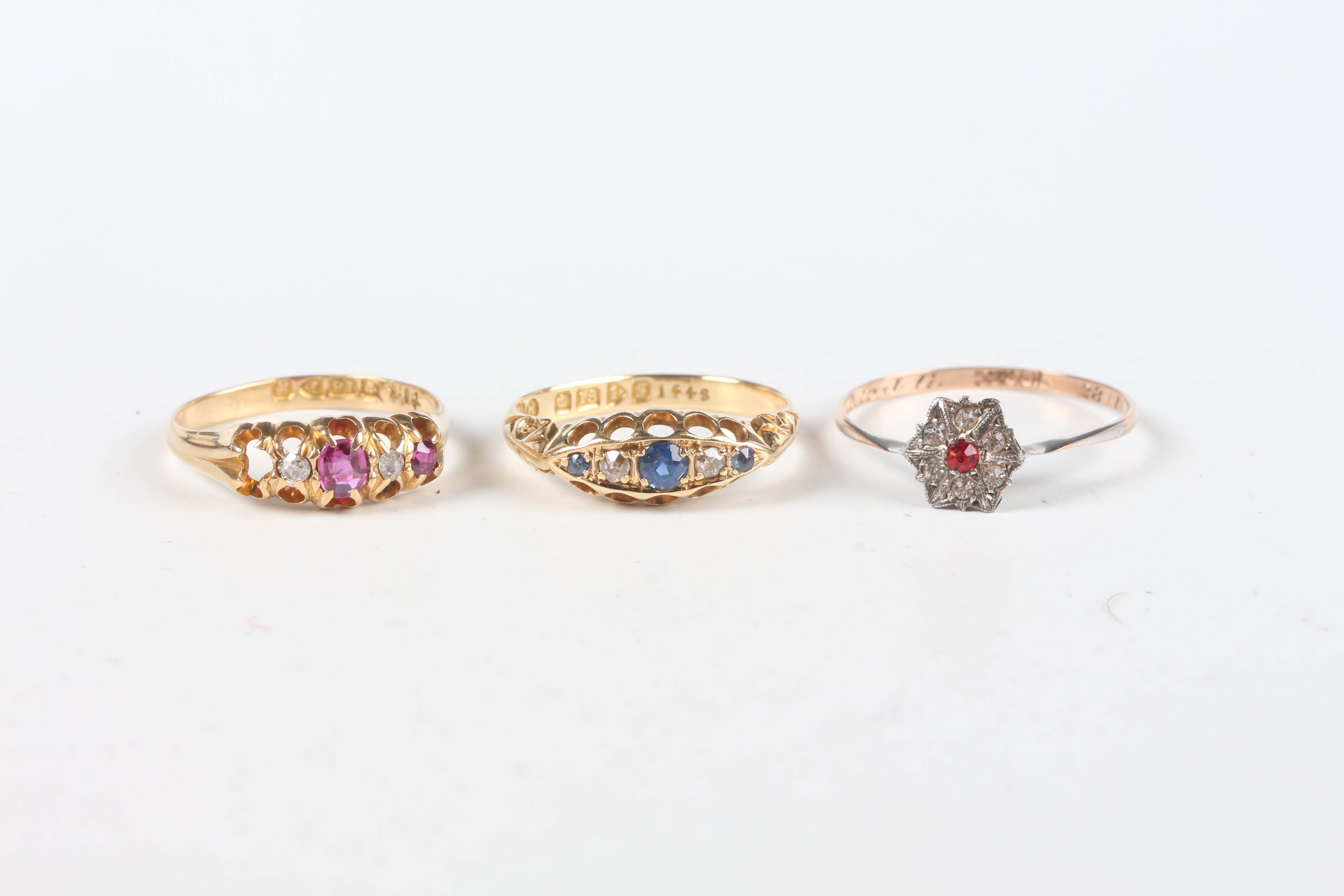 An 18ct gold, sapphire and diamond five stone ring, Chester 1906, ring size approx J, an 18ct gold ring, mounted with two rubies and two diamonds, Chester 1902, ring size approx L (one ruby lacking), total weight 4.2g, and a gold and silver set, red and colourless paste cluster ring, detailed ‘9ct&Sil’, weight 0.9g, ring size approx P.