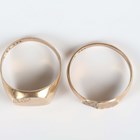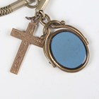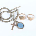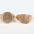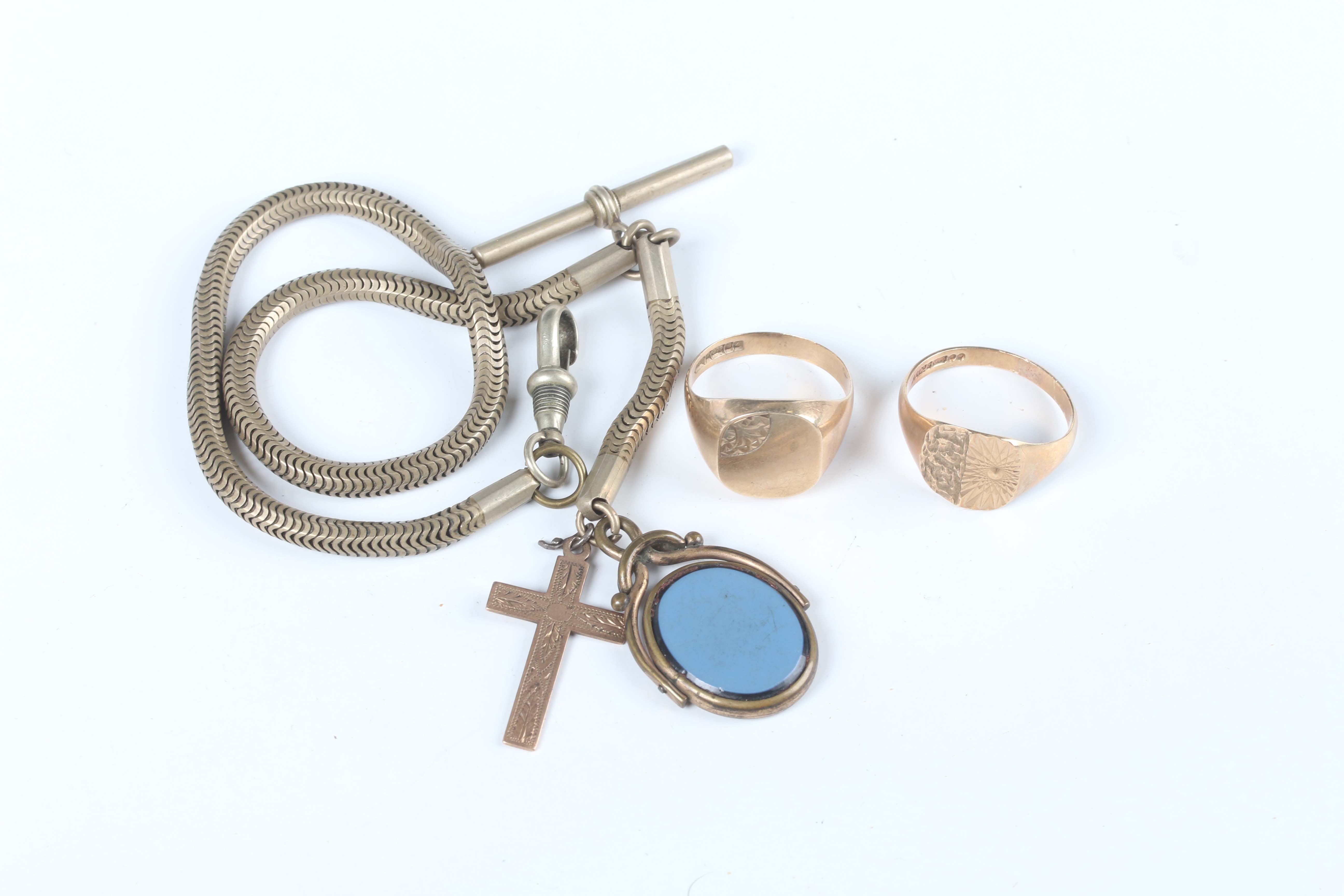 Two 9ct gold signet rings, each with engraved decoration, total weight 7.2g, ring sizes approx S1/2 and U, and a gilt metal Albert watch chain, fitted with a 9ct gold pendant cross.