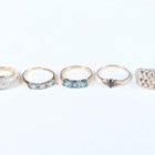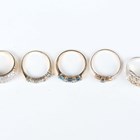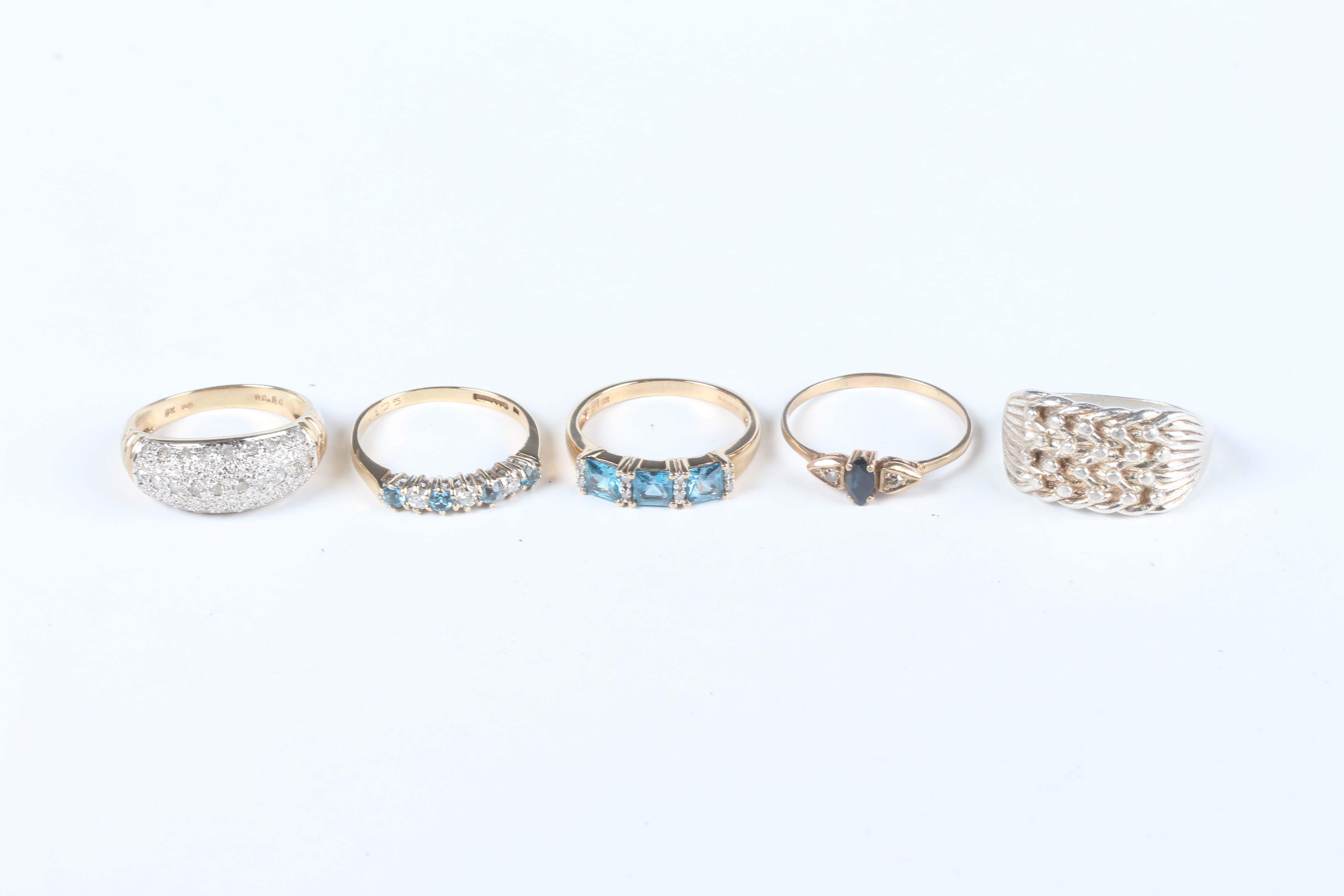 A 9ct gold and diamond ring in a curved bombé design, mounted with circular cut diamonds, ring size approx O1/2, two 9ct gold, diamond and pale blue gem set rings, a 9ct gold, sapphire and diamond three stone ring, total weight 9.5g, and a silver ring, detailed ‘925’.