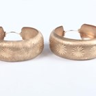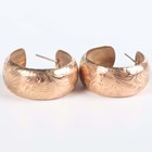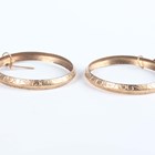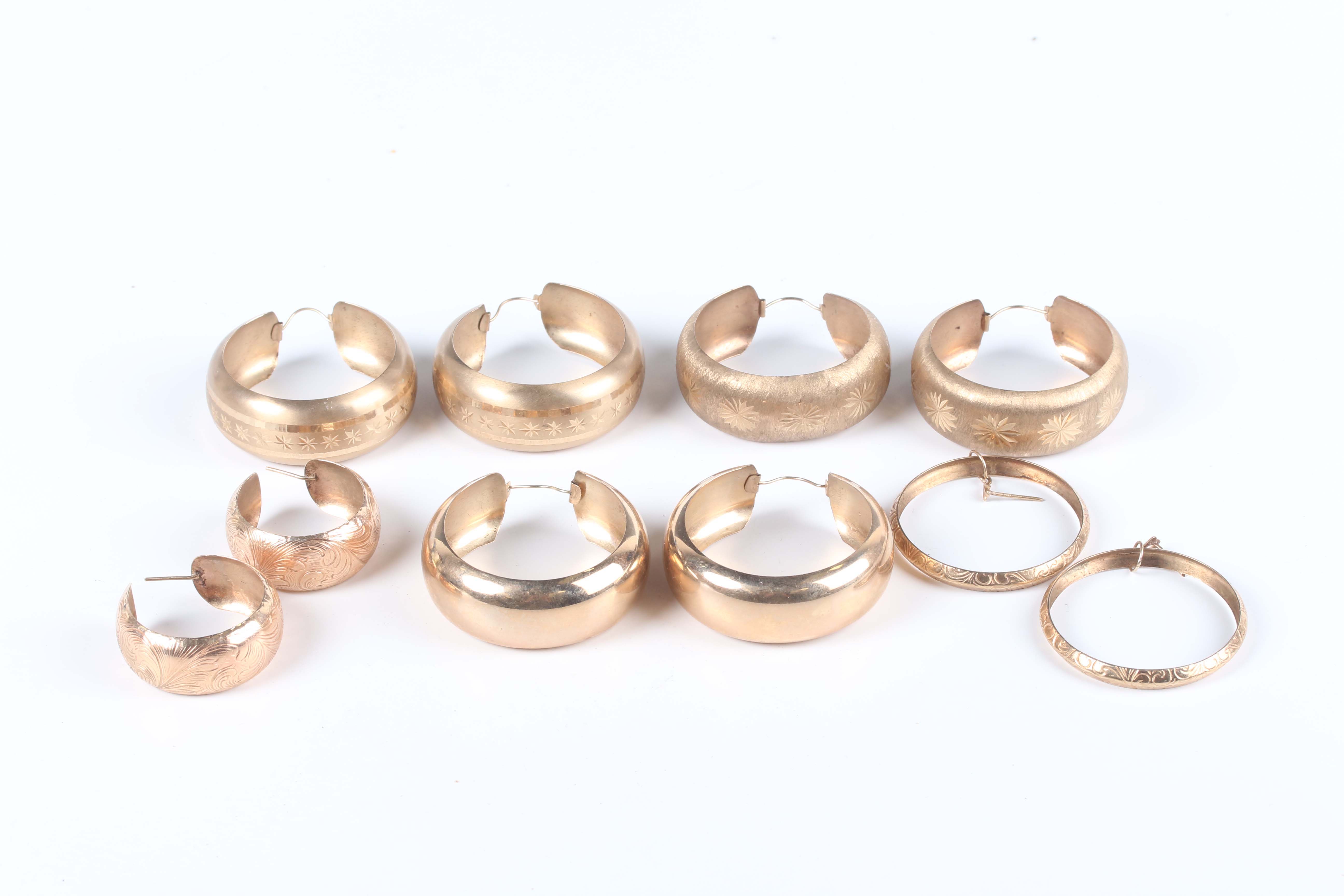 A pair of 9ct gold hoop shaped earrings with engraved scroll decoration, diameter 3cm, two pairs of 9ct gold hoop shaped earrings, each with star engraved decoration, diameters 4.3cm and 4.5cm, and two other pairs of 9ct gold hoop shaped earrings, total weight 52.6g.