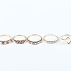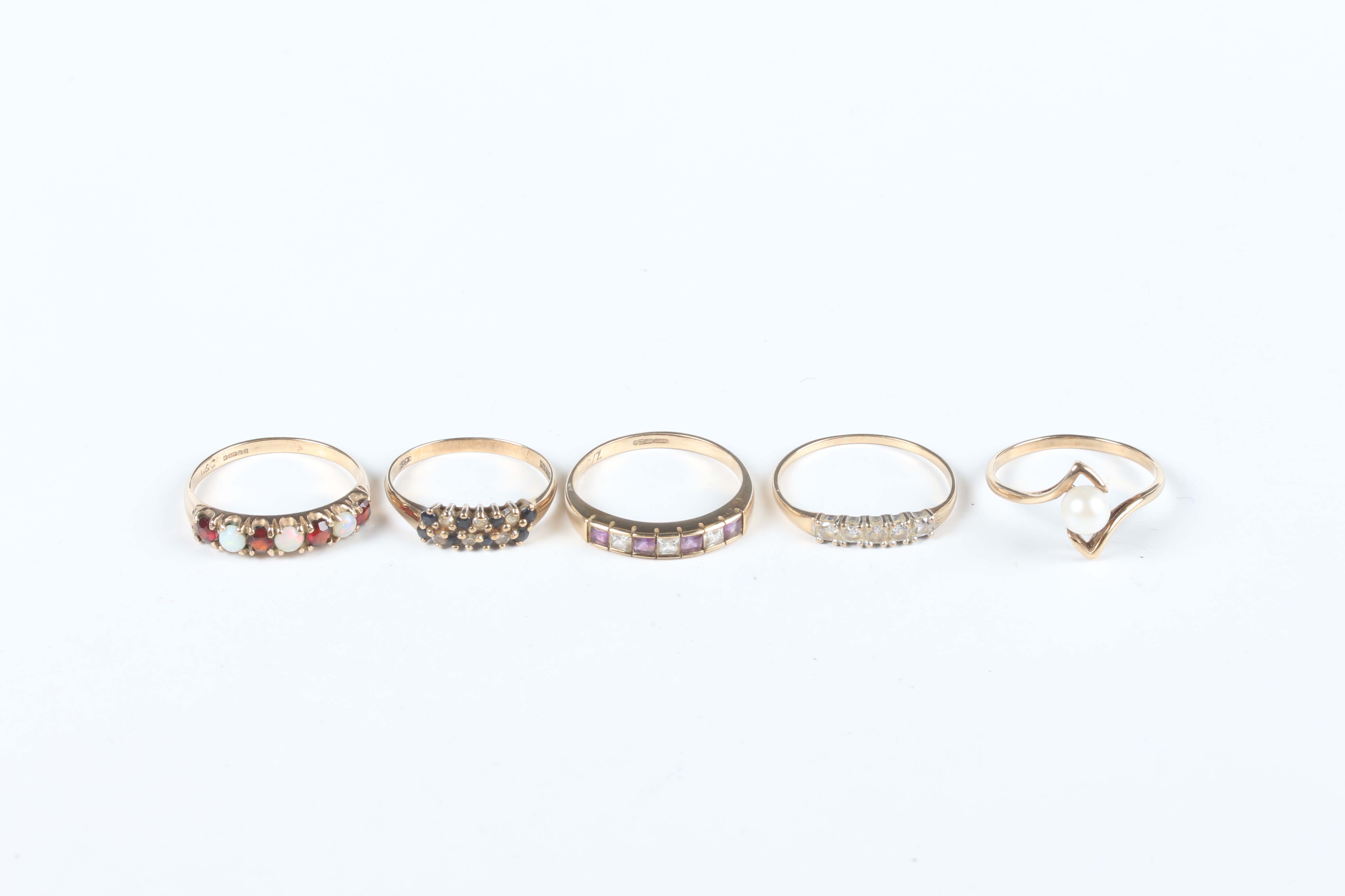 A 9ct gold, opal and garnet seven stone ring, ring size approx Q, a 9ct gold ring, mounted with a cultured pearl, a gold, amethyst and colourless gem set seven stone ring and two further gold and gem set rings, total weight 8.2g.