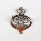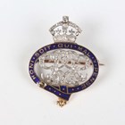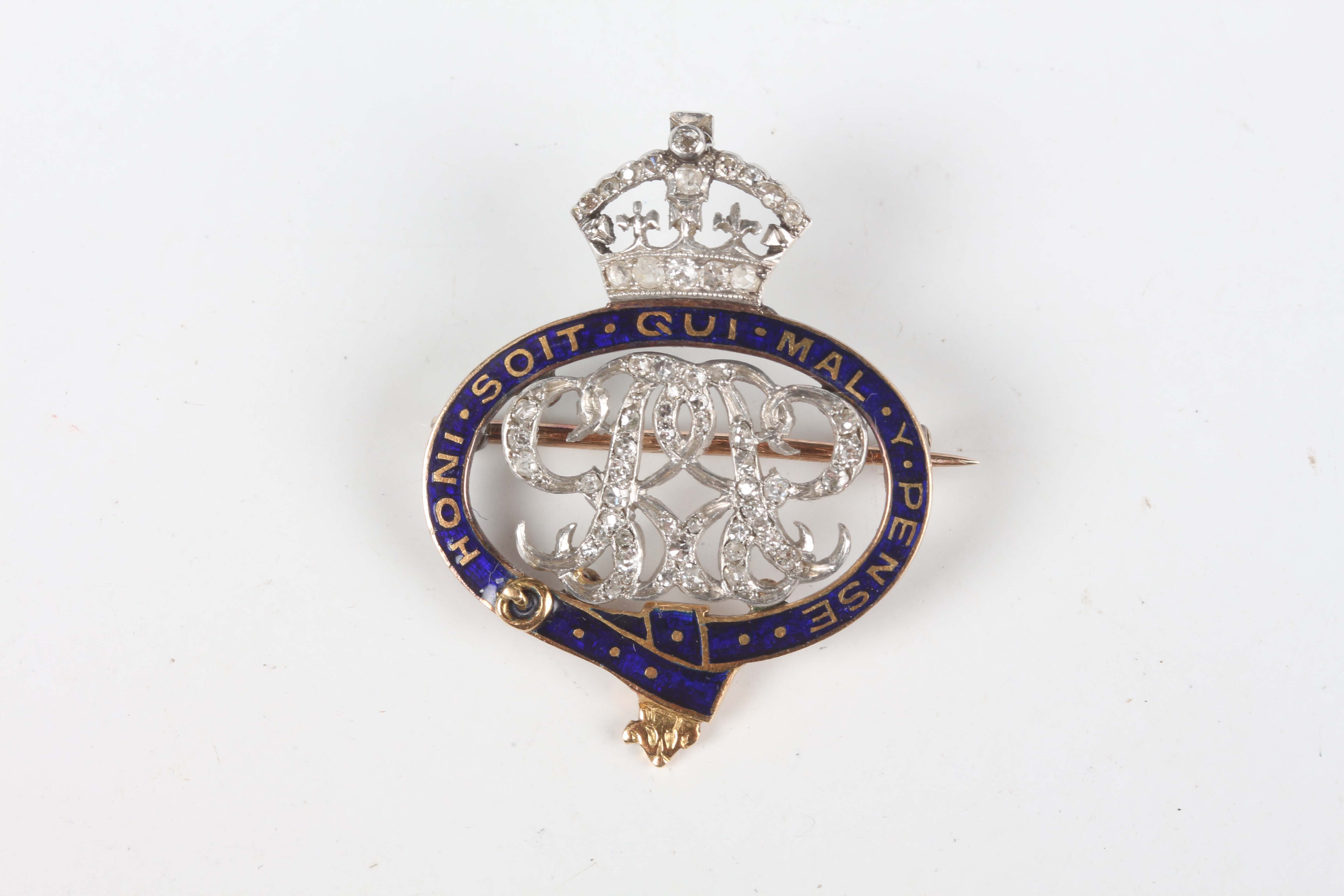 A gold enamelled and diamond set military brooch, designed as the badge of the Grenadier Guards, the central monogram and crown mounted with variously cut diamonds with a blue enamelled garter surround, weight 5.6g, width 2.5cm.