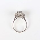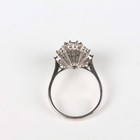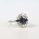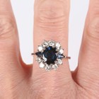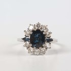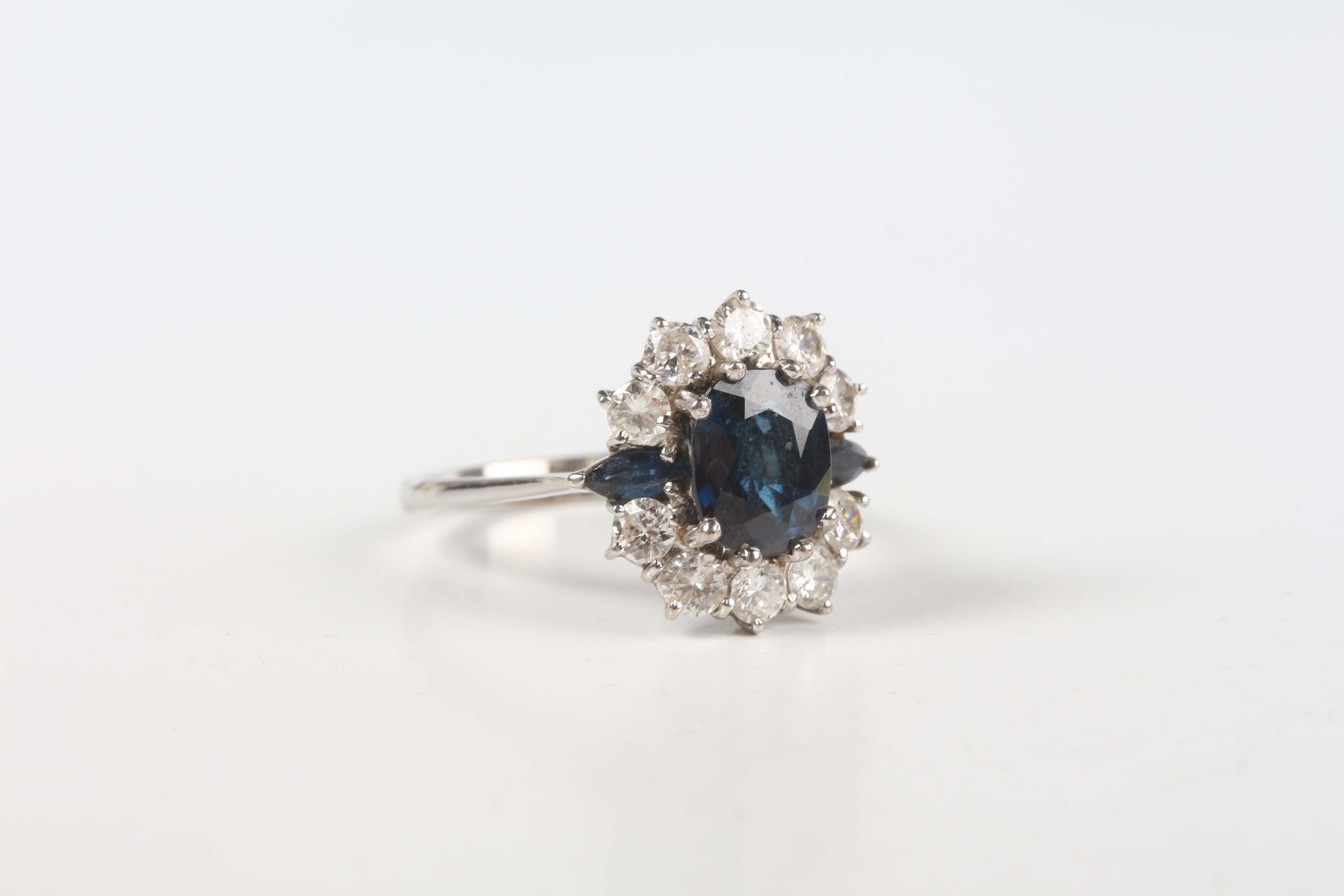 A white gold, sapphire and diamond ring, claw set with the principal oval cut sapphire between two marquise shaped sapphires within a surround of ten circular cut diamonds, unmarked, weight 5.8g, ring size approx Q1/2.