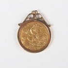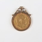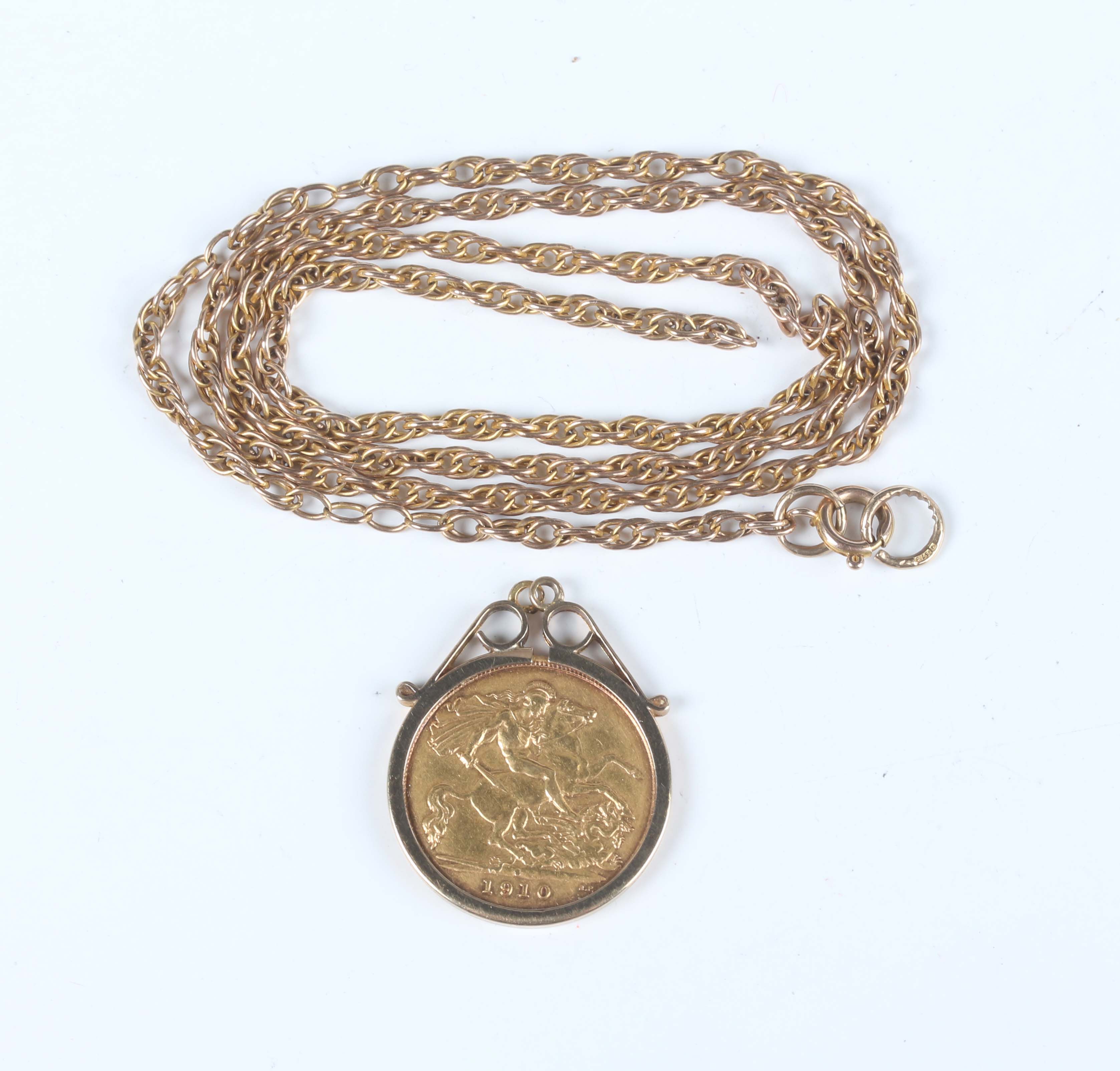 A George V half-sovereign 1910 Sydney mint, in a 9ct gold pendant mount, length 2.5cm, and a 9ct gold neckchain, length 48.5cm, total weight 11.3g.