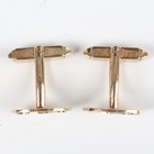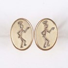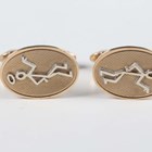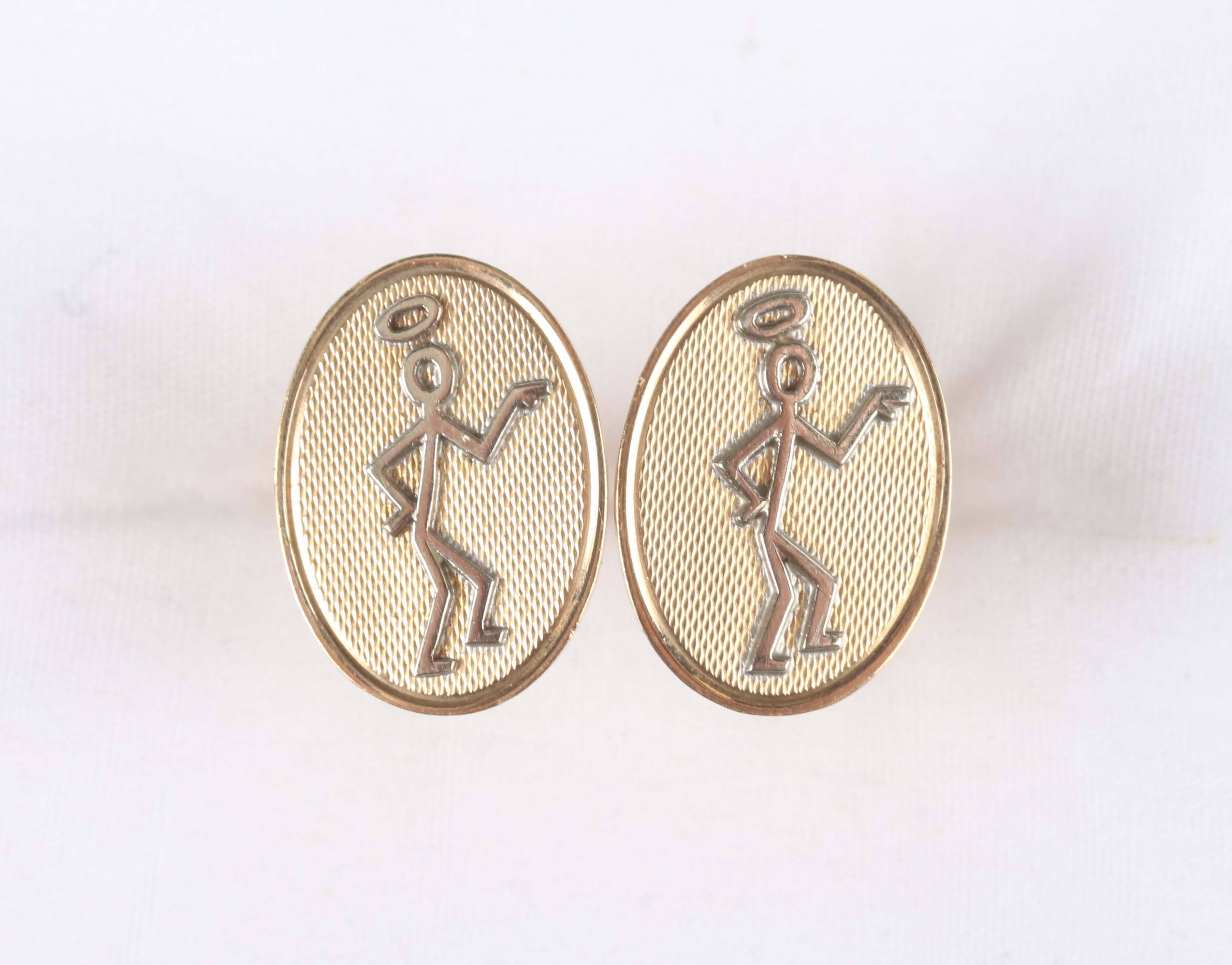 A pair of Elizabeth II 9ct gold 'The Saint' related oval cufflinks, each engine turned front with The Saint stickman logo, with folding sprung bar fittings, Birmingham 1961 by S.J. Rose & Son, total weight 9.5g, dimensions of each front 1.9cm x 1.3cm. Provenance: formerly the property of the author Leslie Charteris (1907-1993), who created the character Simon Templar, 'The Saint', in a hugely popular series of novels and short stories published between 1928 and 1963.
