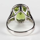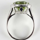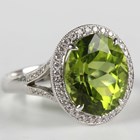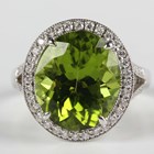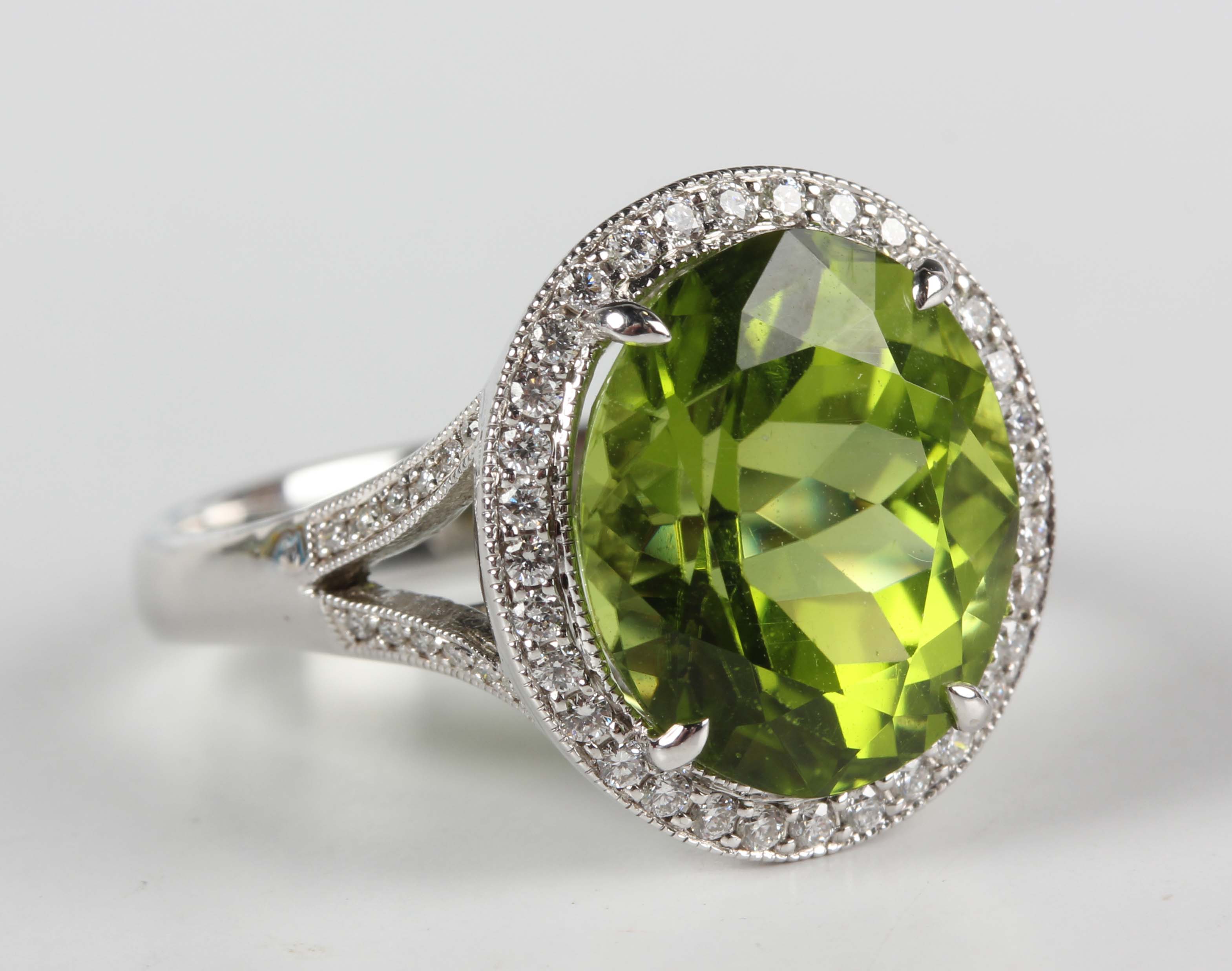 A white gold, peridot and diamond cluster ring, claw set with an oval cut peridot within a surround of round brilliant cut diamonds, between 'V' shaped diamond set shoulders, detailed '750', weight 6.6g, peridot weight approx 7.02ct, total diamond weight approx 0.28ct, ring size approx M1/2.