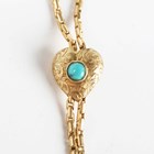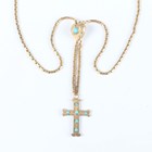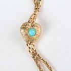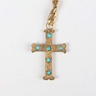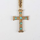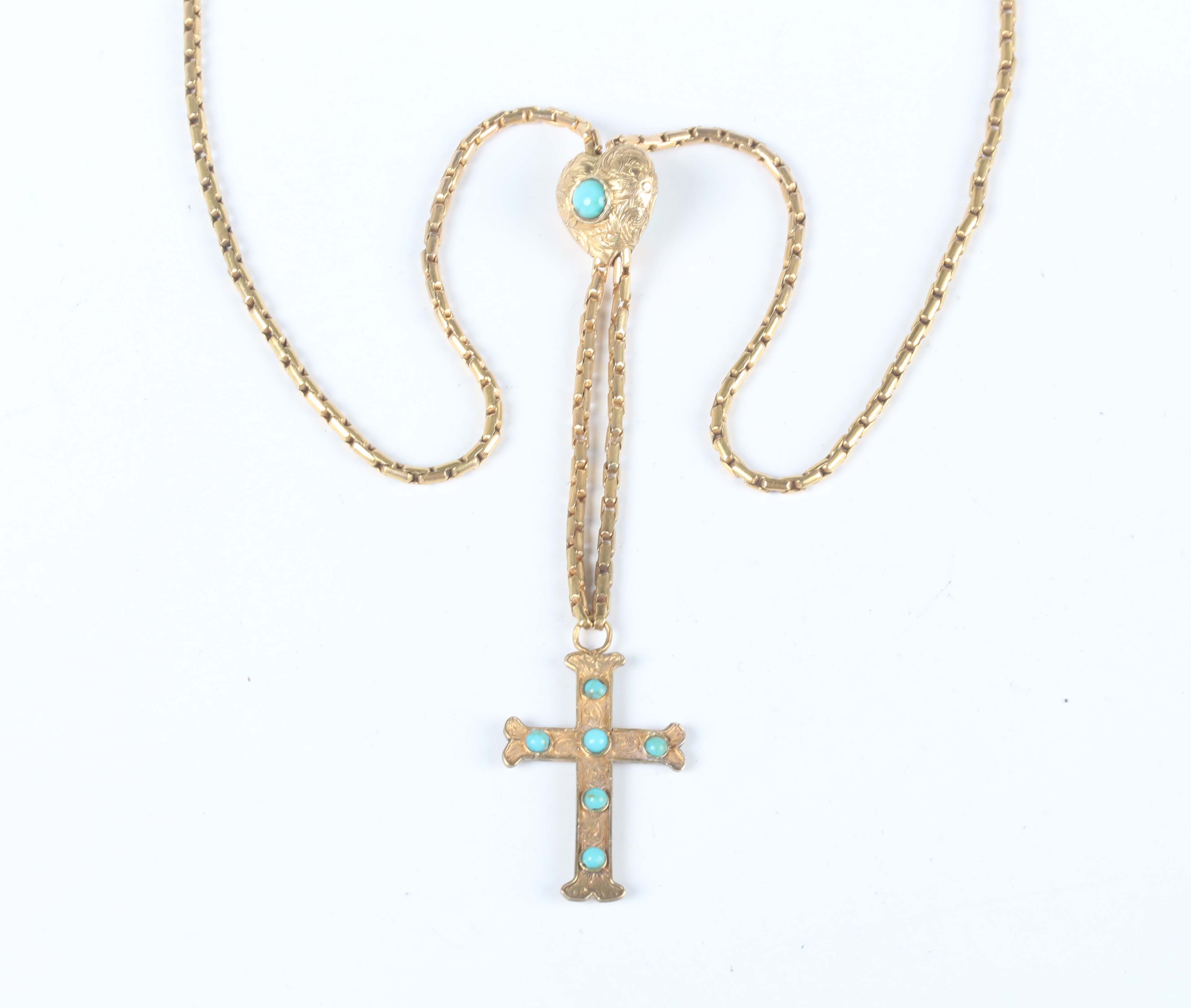 A Victorian gold and turquoise pendant cross necklace with a heart shaped slide, the oval link chain with a snap clasp, detailed '15', total weight 14g, chain length 49cm, length of cross 2.8cm, length of heart slide 1.1cm.