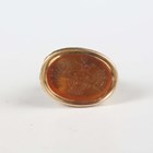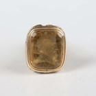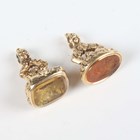 A gold cased and citrine fob seal, the citrine matrix carved with a profile bust portrait of a bearded gentleman wearing a crown, height 2.7cm, and another gold mounted fob seal, the matrix carved with a classical figure and chariot with four horses, height 2.5cm.