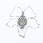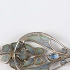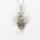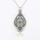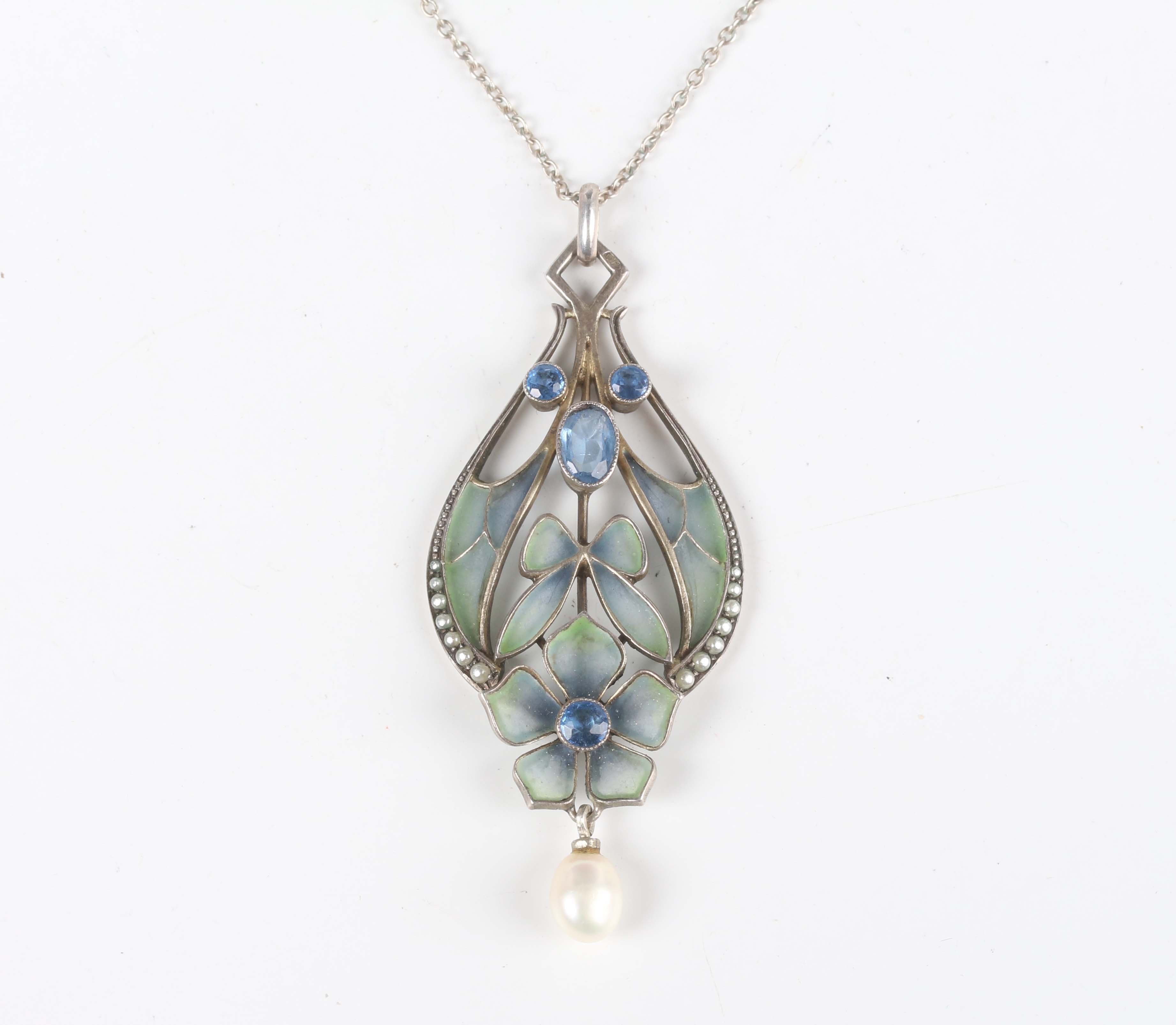 A French Art Nouveau silver, plique-à-jour enamel, blue paste, imitation seed pearl and associated freshwater cultured pearl pendant in an openwork floral and foliate design, detailed ‘900 Depose’, length 6.3cm, with a silver neckchain, detailed ‘835’, length 41cm, total weight 8.2g, with an associated case.